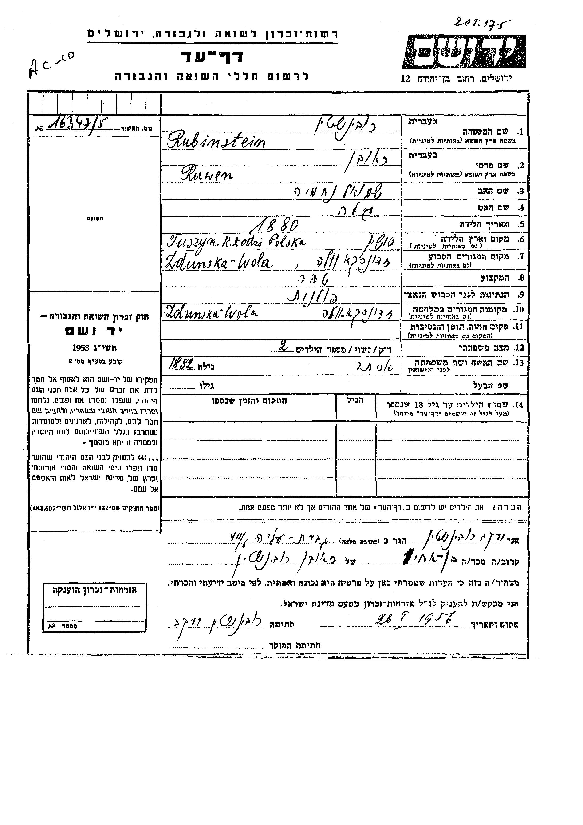 Ruwen Rubinstein wurde im Jahr 1880 in Tuszyn, Polen geboren. Er war der Sohn von Shmuel Nekhemia und Gila. Er war Schneider und mit Ester Verheiratet. Vor dem Zweiten Weltkrieg lebte er in Zdunska Vola, Polen. Während des Krieges war er in Zdunska Vola, Polen.