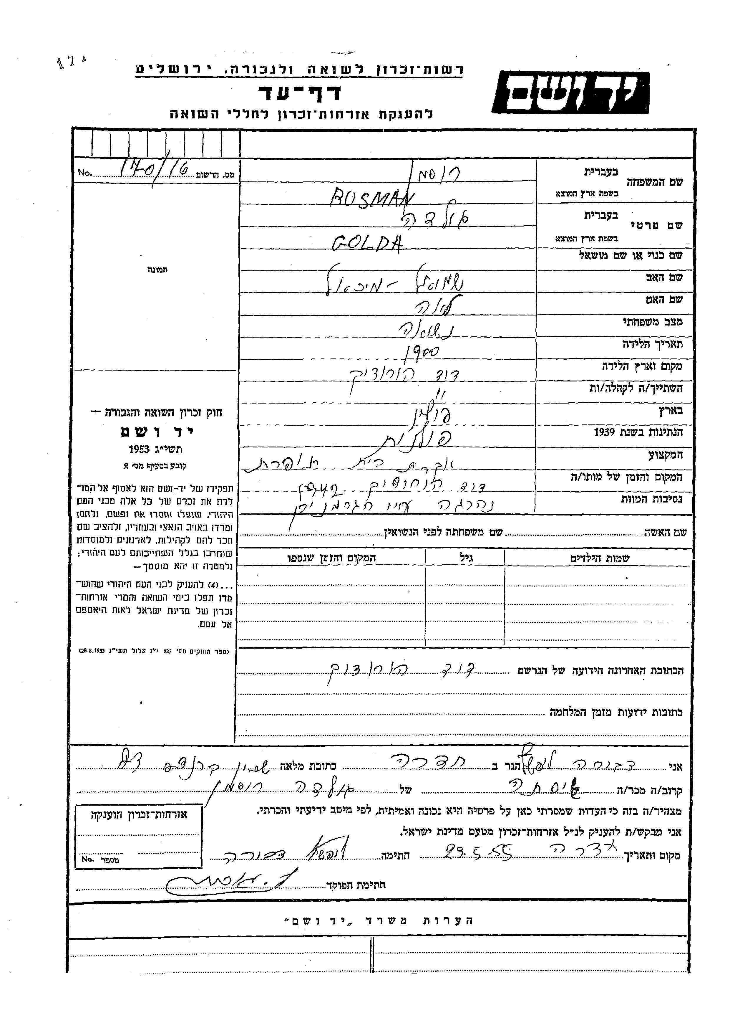 Golda Rosman wurde im Jahr 1900 in Davidgrodek, Polen geboren. Sie war die Tochter von Shmuel Mikhael und Lea. Sie war Schneiderin und Verheiratet. Während des Krieges war sie in Davidgrodek, Polen.