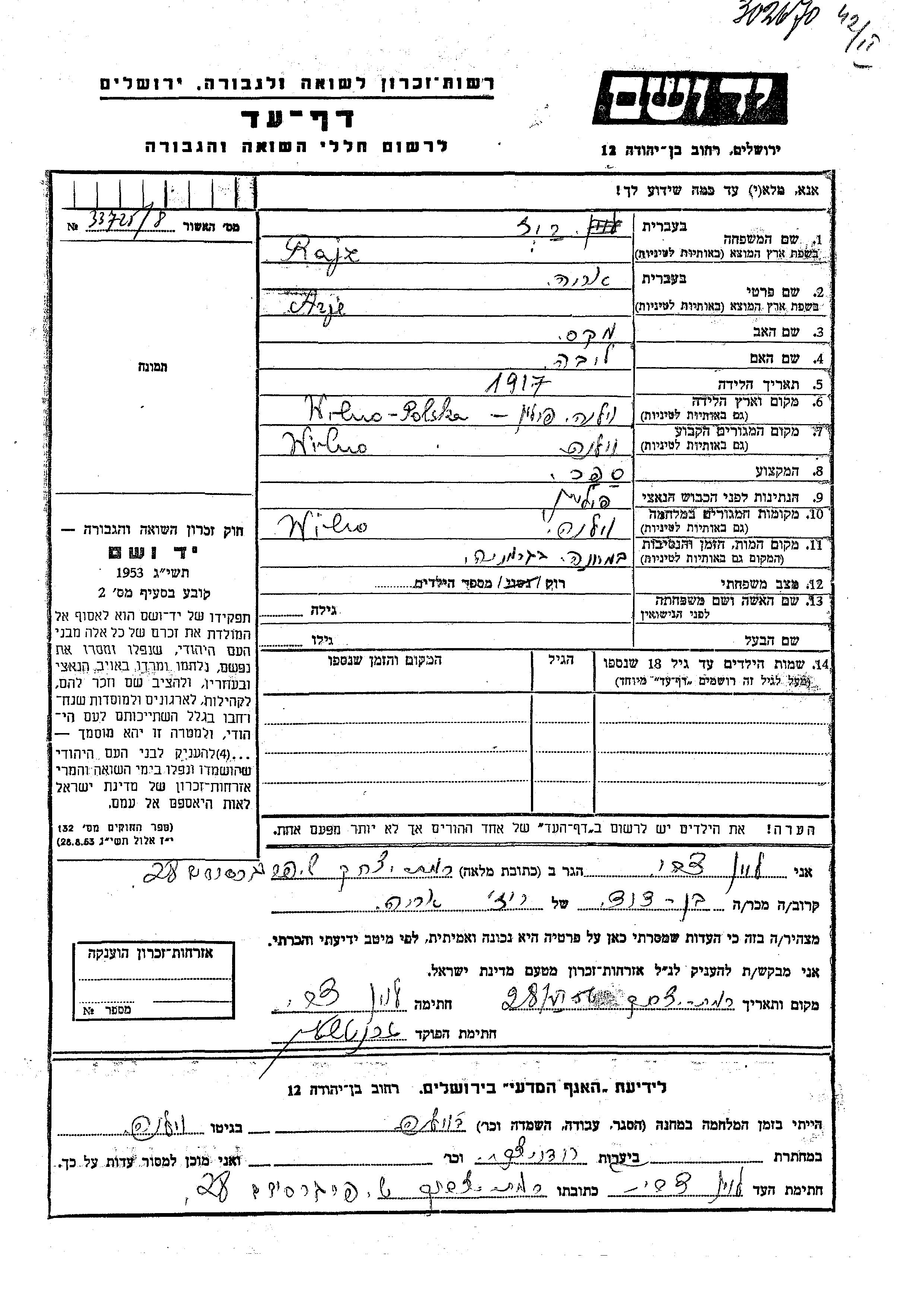 Arje Rajz Riz wurde im Jahr 1917 in Wilno, Polen geboren. Er war der Sohn von Max und Liba. Er war Friseur/-in und Ledig. Vor dem Zweiten Weltkrieg lebte er in Wilno, Polen. Während des Krieges war er in Wilno, Polen.