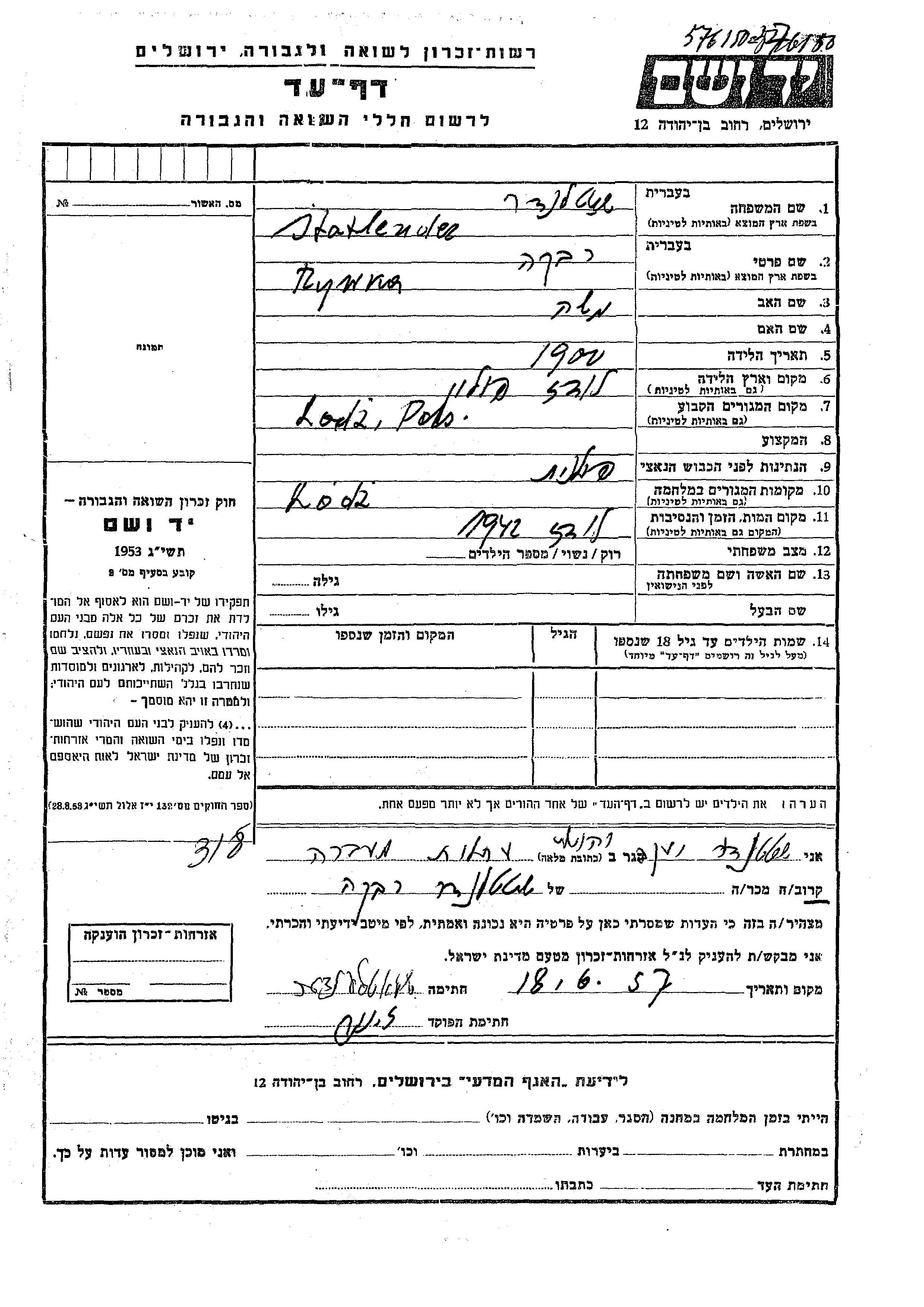 Rywka Statlender wurde im Jahr 1900 in Lodz, Polen geboren. Sie war die Tochter von Moshe. Vor dem Zweiten Weltkrieg lebte sie in Lodz, Polen. Während des Krieges war sie in Lodz, Polen.