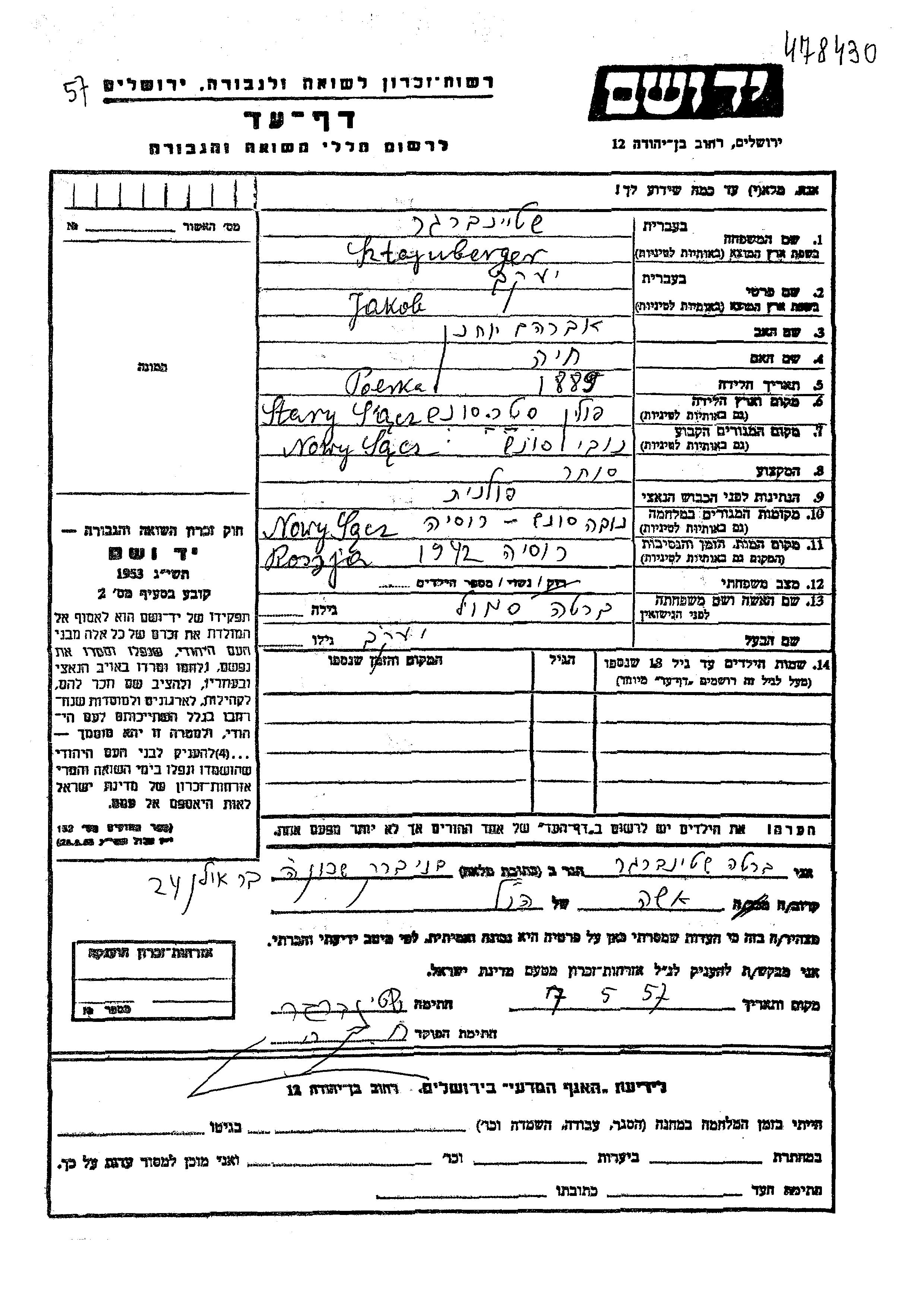 Jakob Sztajnberger wurde im Jahr 1889 in Stary Sacz, Polen geboren. Er war der Sohn von Avraham Yokhanan und Khaia. Er war Kaufmann/-frau und mit Berta, geb. Smol Verheiratet. Vor dem Zweiten Weltkrieg lebte er in Nowy Sacz, Polen. Während des Krieges war er in Nowy Sacz, Polen.