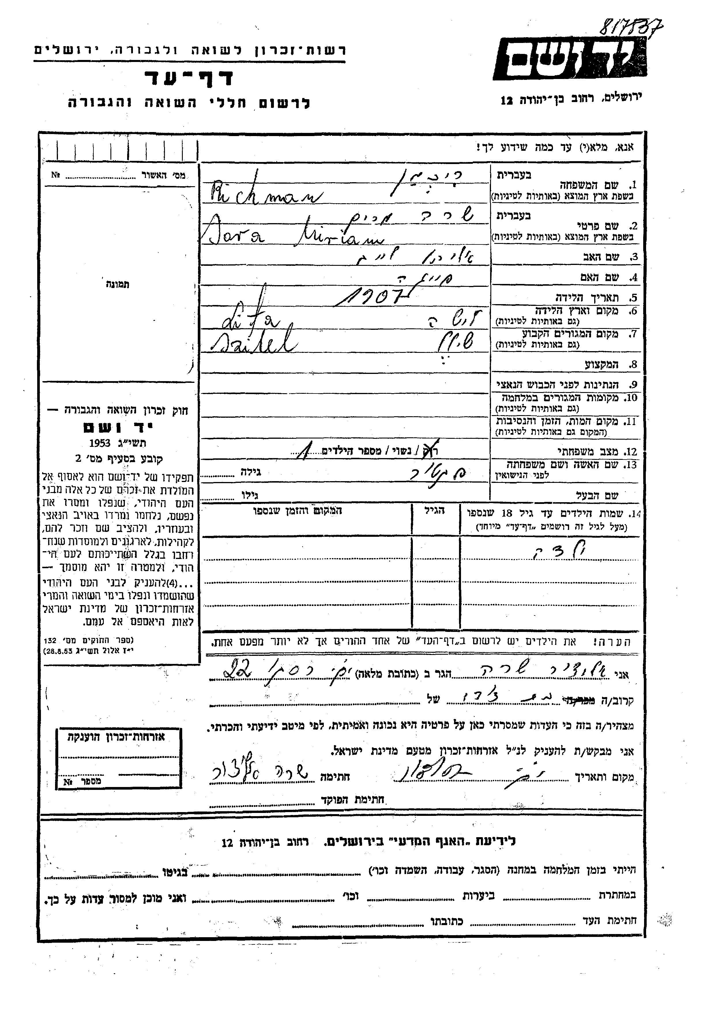 Richman Sara Miriam 1907 Szilel, Litauen Gedenkblatt