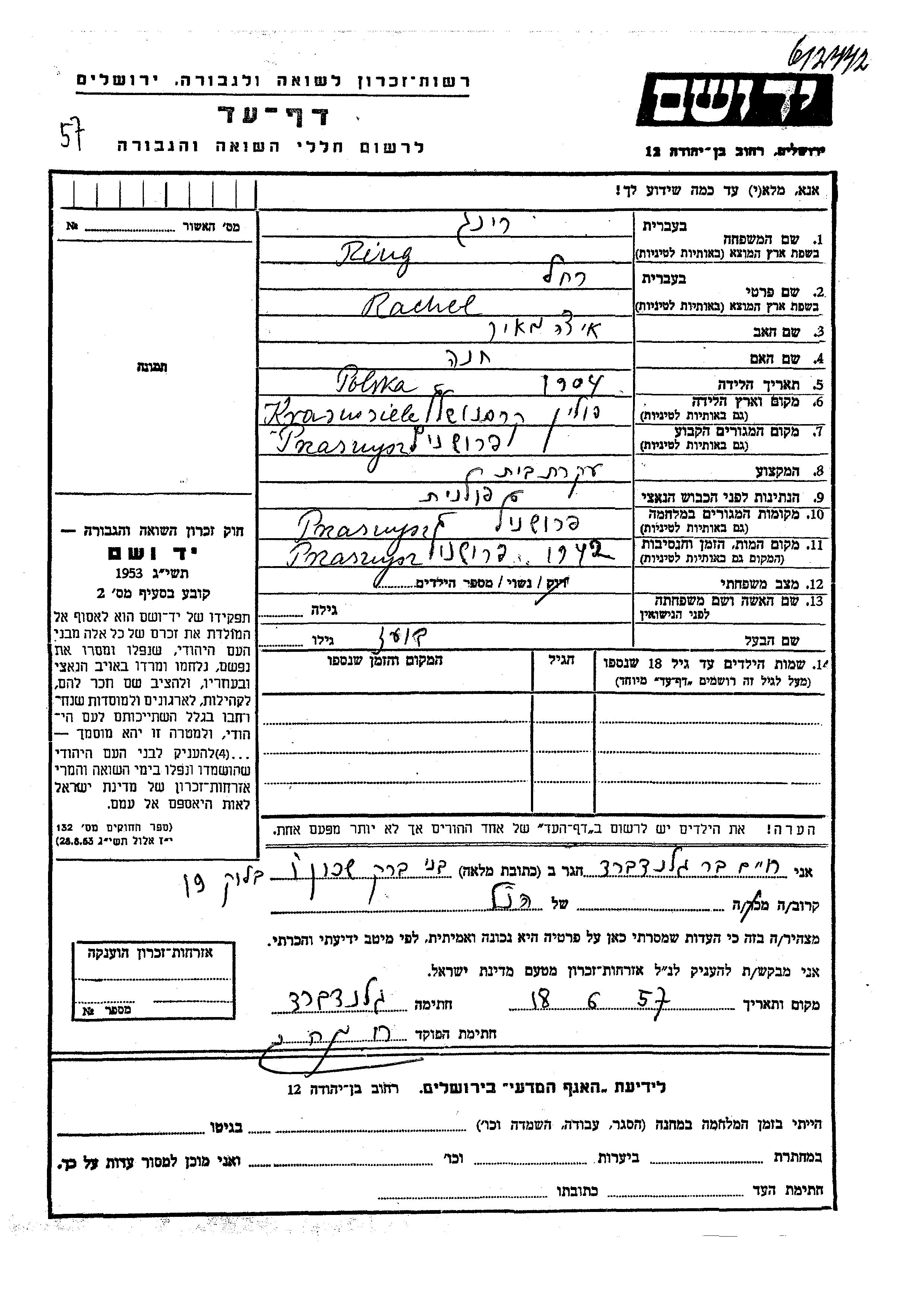 Rachel Ring wurde im Jahr 1904 in Krasnosielc, Polen geboren. Sie war die Tochter von Icie Meir und Khana. Sie war Hausfrau und mit Boaz Verheiratet. Vor dem Zweiten Weltkrieg lebte sie in Przasnysz, Polen. Während des Krieges war sie in Przasnysz, Polen.