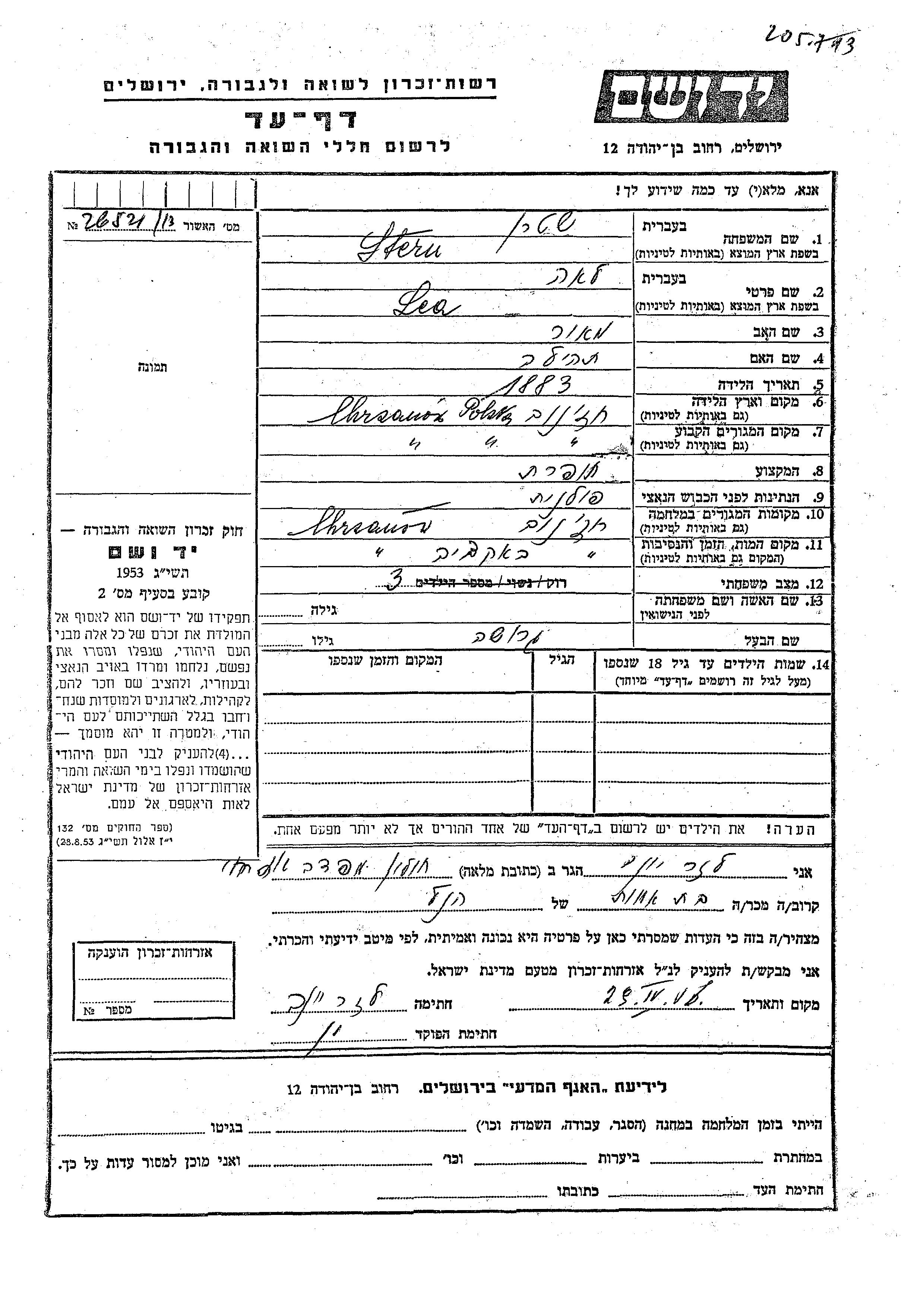 Lea Stern wurde im Jahr 1883 in Chrzanow, Polen geboren. Sie war die Tochter von Meir und Tehila. Sie war Schneiderin und Geschieden. Vor dem Zweiten Weltkrieg lebte sie in Chrzanow, Polen. Während des Krieges war sie in Chrzanow, Polen.