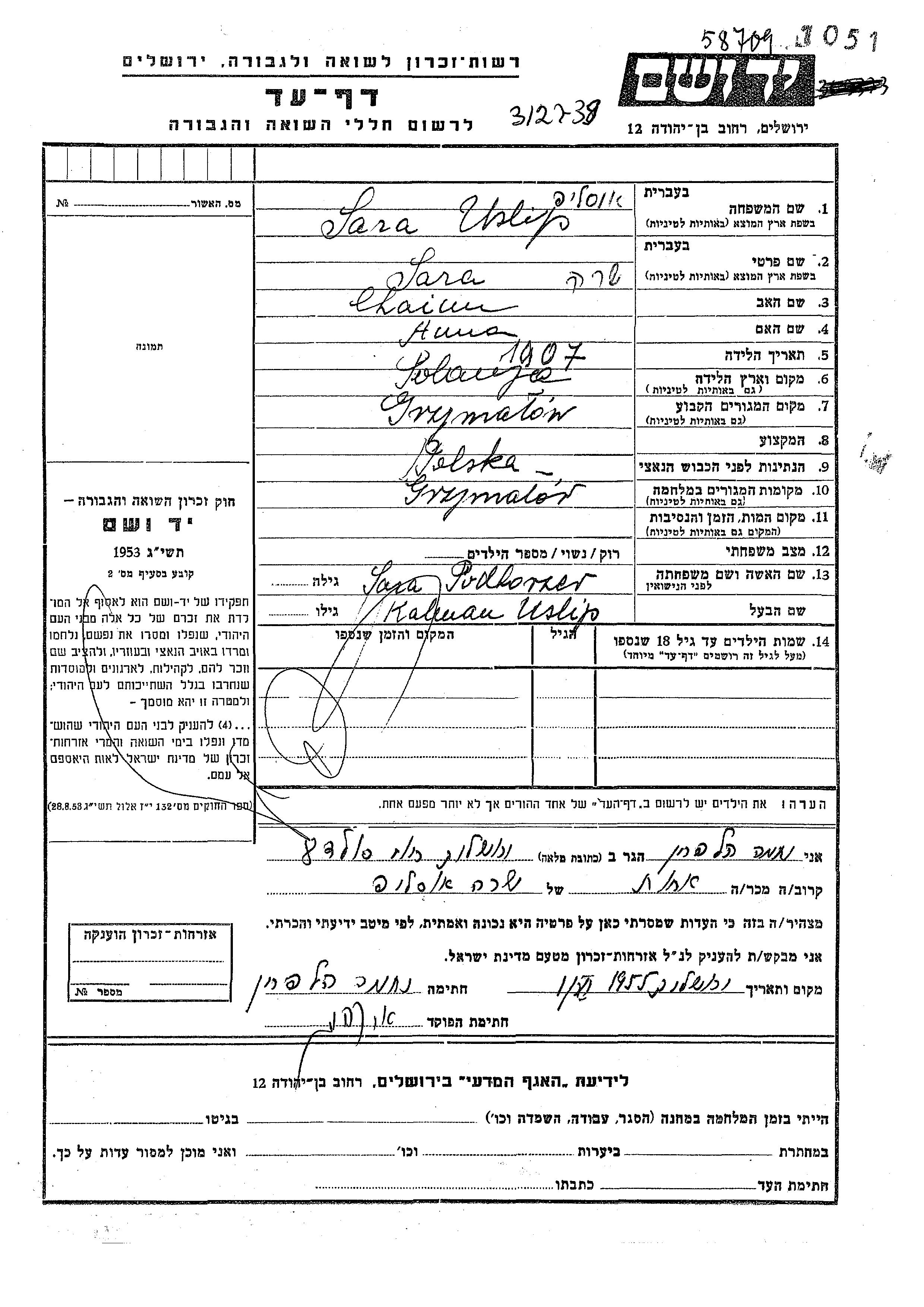 Sara Uslip, geb. Podhorzer wurde im Jahr 1907 in Polen geboren. Sie war die Tochter von Chaim und Huna. Sie war mit Kalman Verheiratet. Vor dem Zweiten Weltkrieg lebte sie in Grzymalow, Polen. Während des Krieges war sie in Grzymalow, Polen.