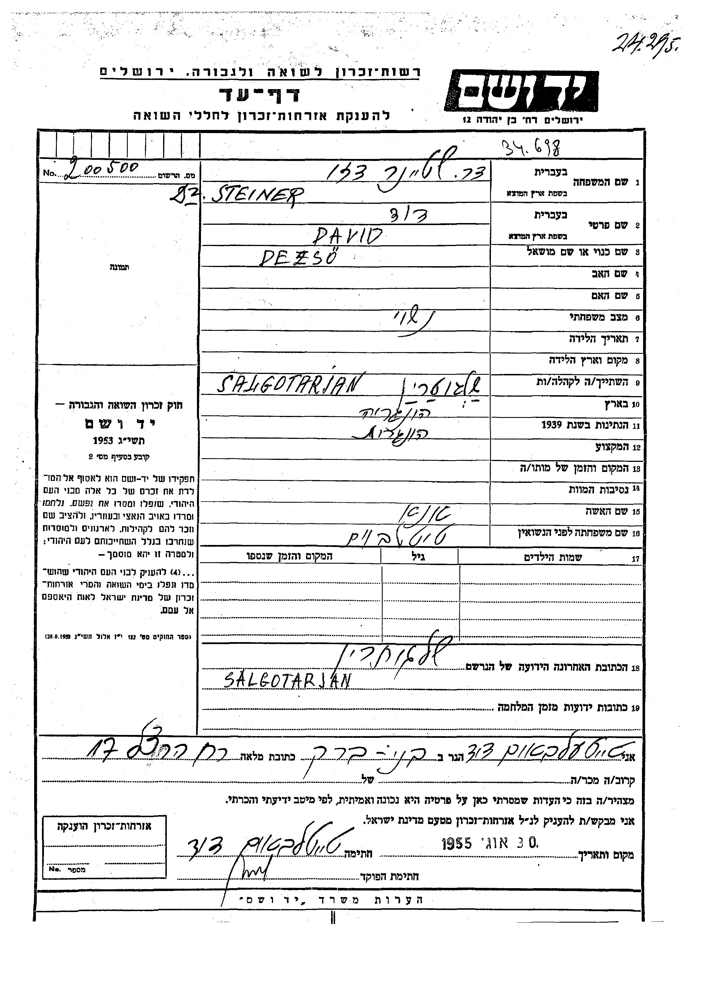 Dr. Dezso David Steiner. Er war mit Ana, geb. Teitelbaum Verheiratet. Vor dem Zweiten Weltkrieg lebte er in Salgotarjan, Ungarn.