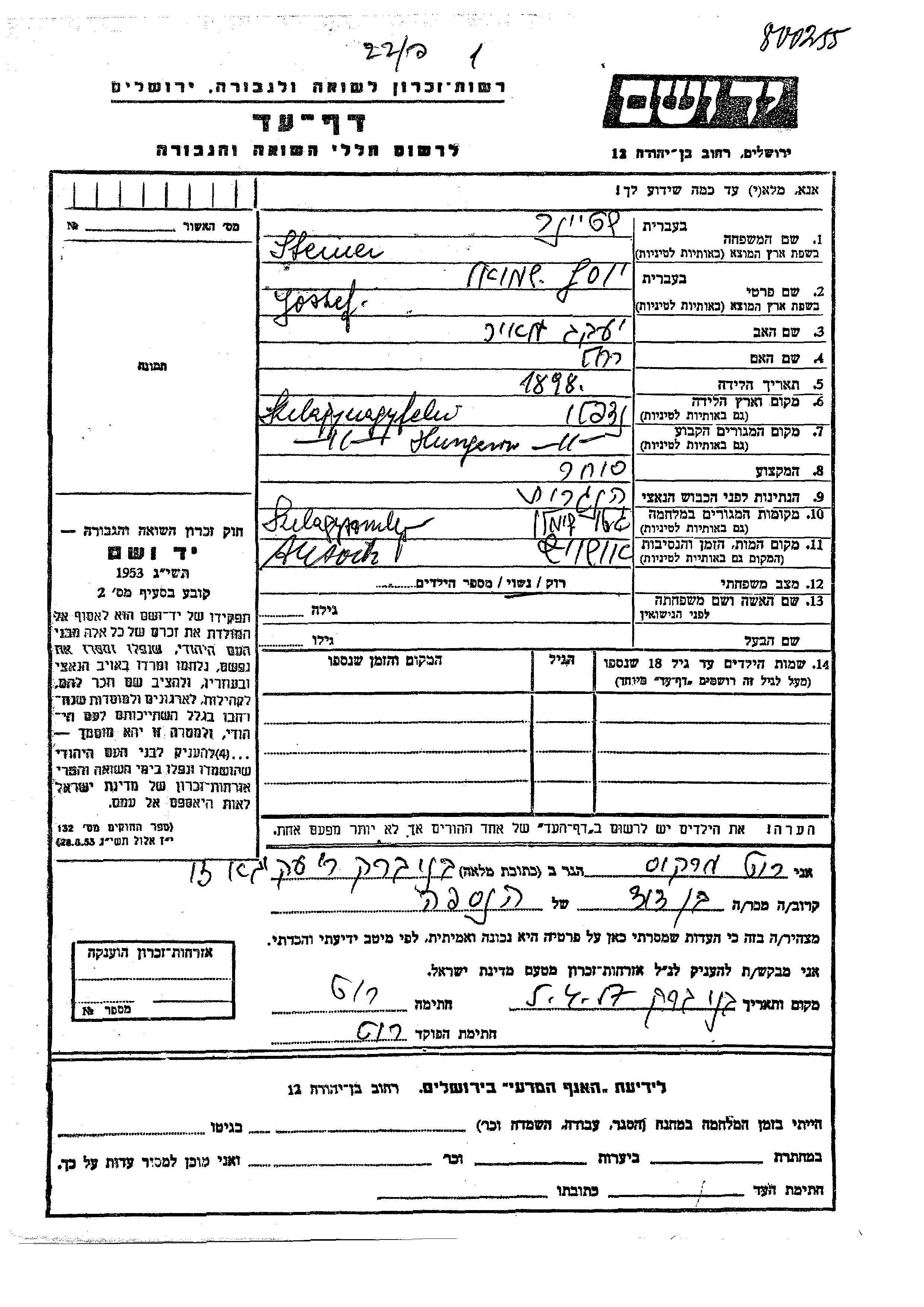Joszef Shmuel Steiner wurde im Jahr 1898 in Szilagynagyfalu, Rumänien geboren. Er war der Sohn von Yaakov Meir und Rakhel. Er war Kaufmann/-frau und Verheiratet. Vor dem Zweiten Weltkrieg lebte er in Szilagynagyfalu, Rumänien. Während des Krieges war er in Szilagysomlyo, Rumänien.