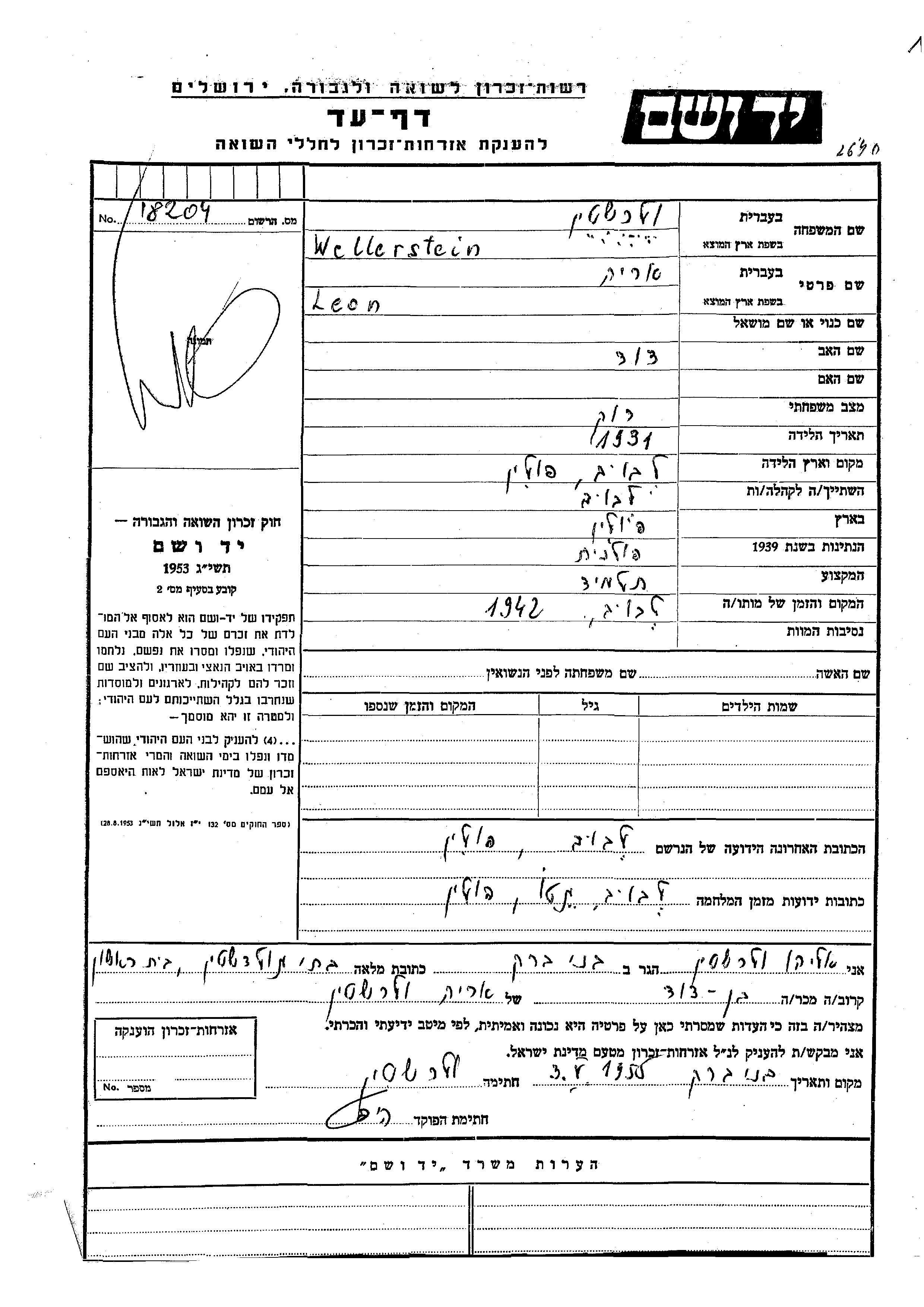 Leon Arie Wellerstein wurde im Jahr 1931 in Lwow, Polen geboren. Er war der Sohn von David. Er war Schüler/-in und Ledig. Vor dem Zweiten Weltkrieg lebte er in Lwow, Polen. Während des Krieges war er in Lwow, Polen.