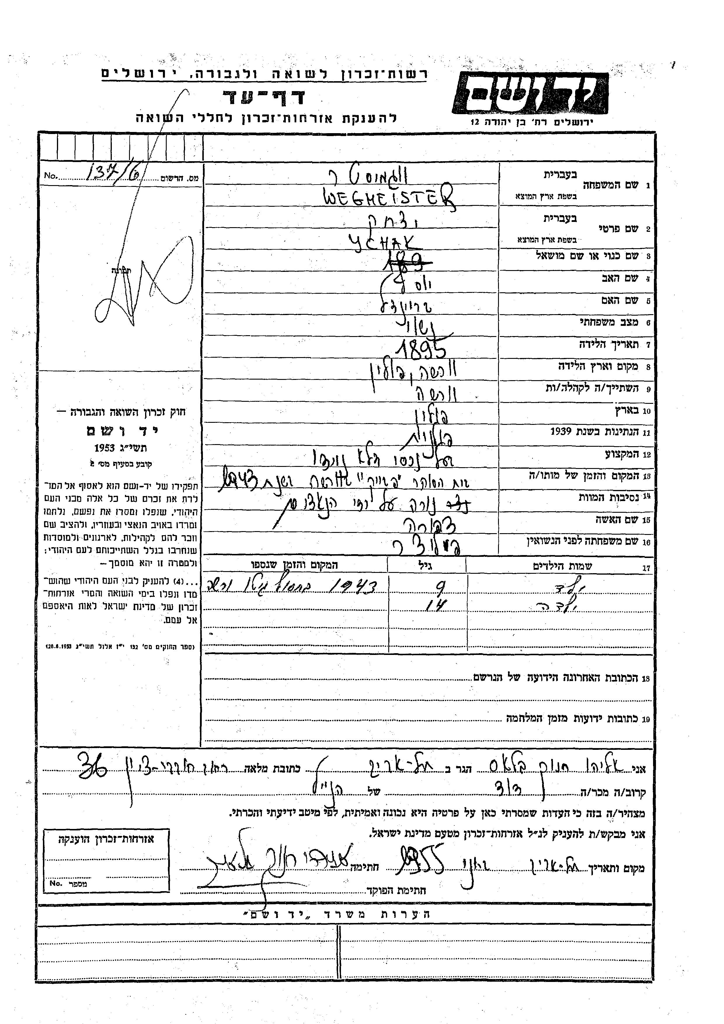 Ychak Wegmeister wurde im Jahr 1895 in Warsaw, Polen geboren. Er war der Sohn von Yosef und Braindel. Er war Immobilienbesitzer/in und mit Dvora, geb. Politzer Verheiratet. Vor dem Zweiten Weltkrieg lebte er in Warsaw, Polen.