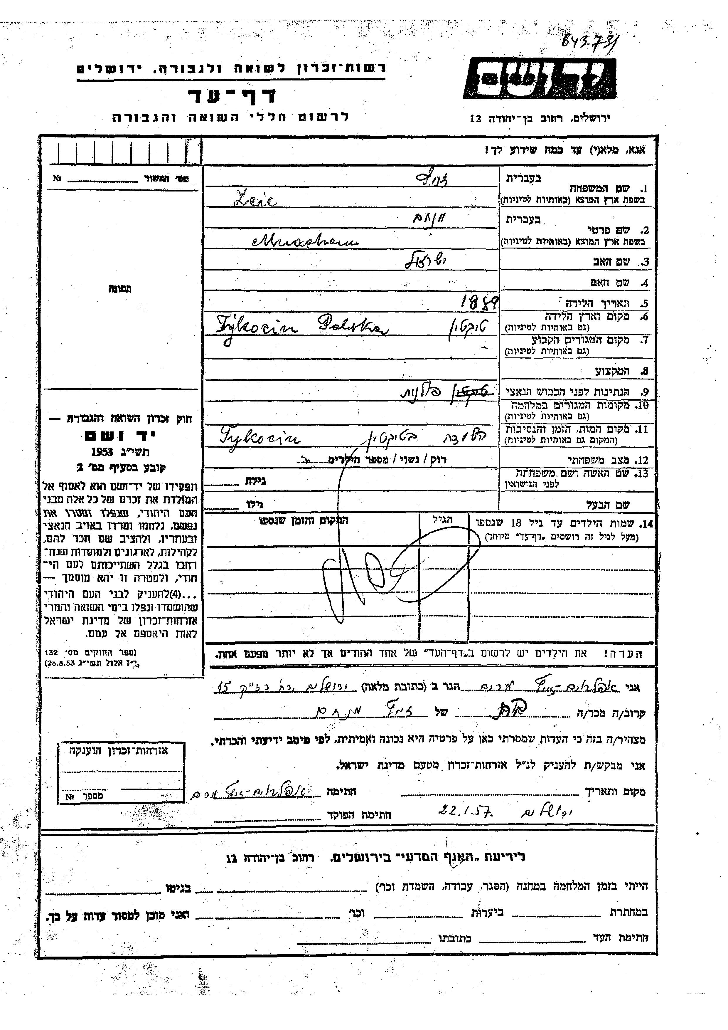 Mnachem wurde in der Schoah ermordet. Todesort: Tykotsin, Polen.