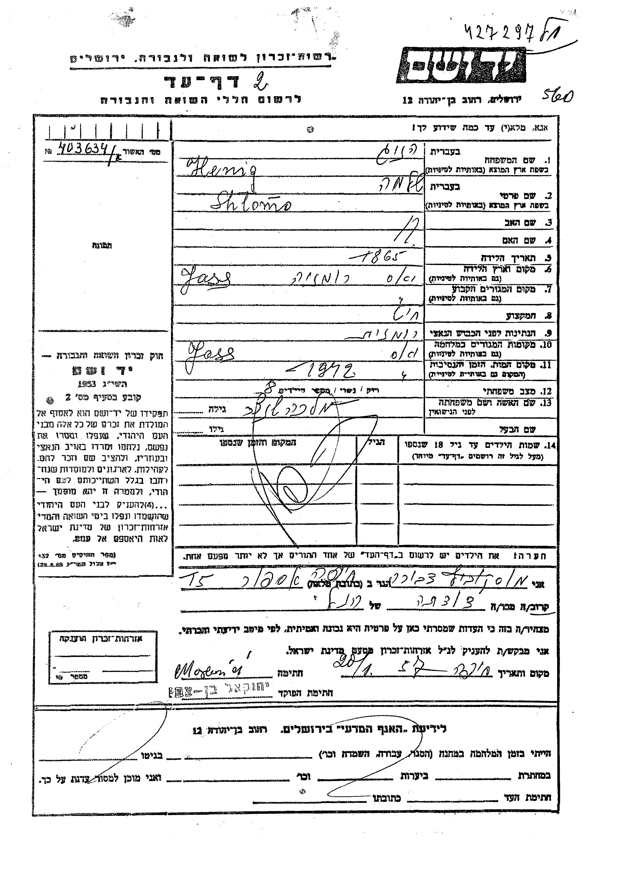 Shlomo wurde in der Schoah ermordet. Todesort: Jassy, Rumänien im Jahr 1942.