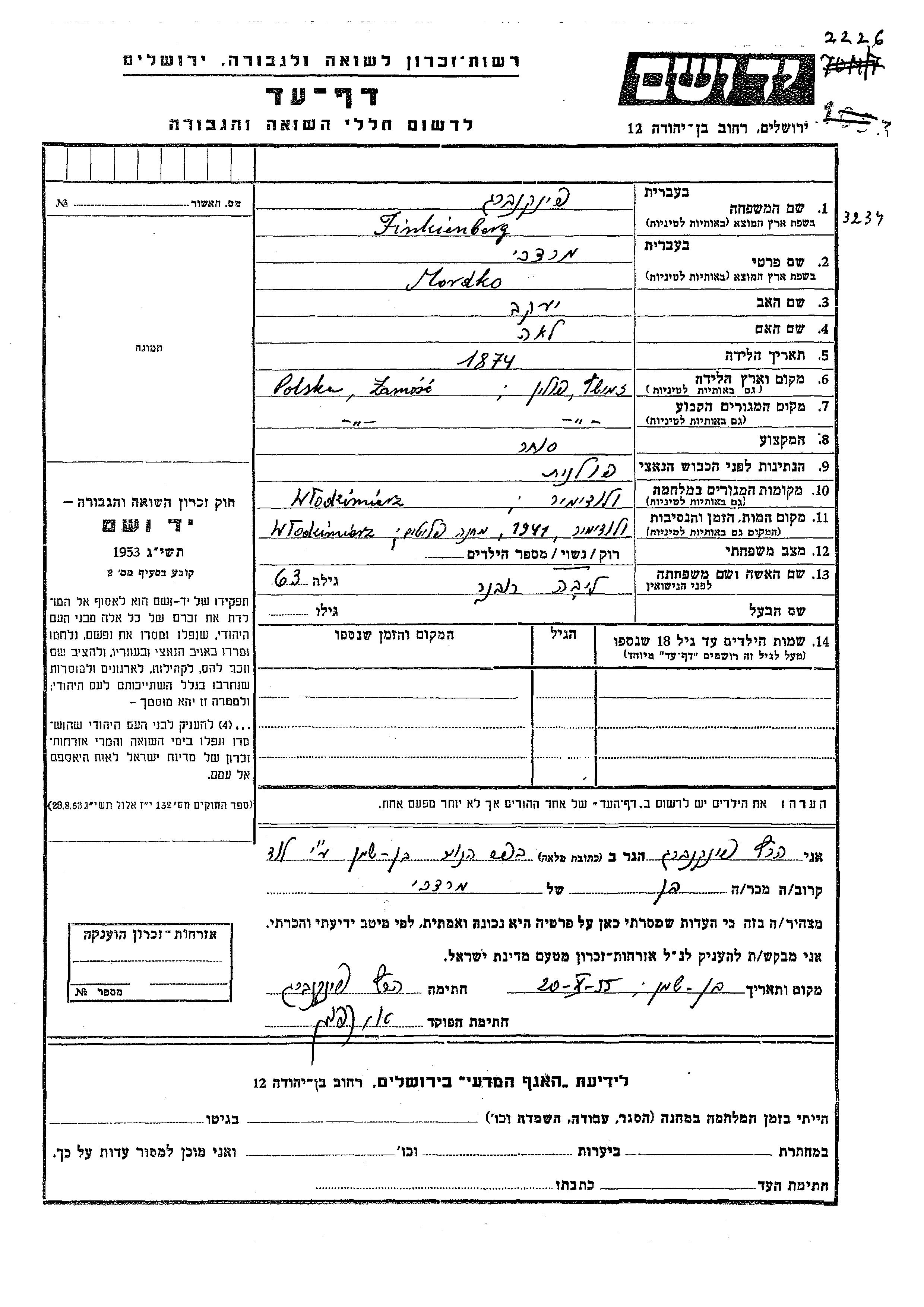 Mordko wurde in der Schoah ermordet. Todesort: Wlodzimierz, Polen im Jahr 1941.