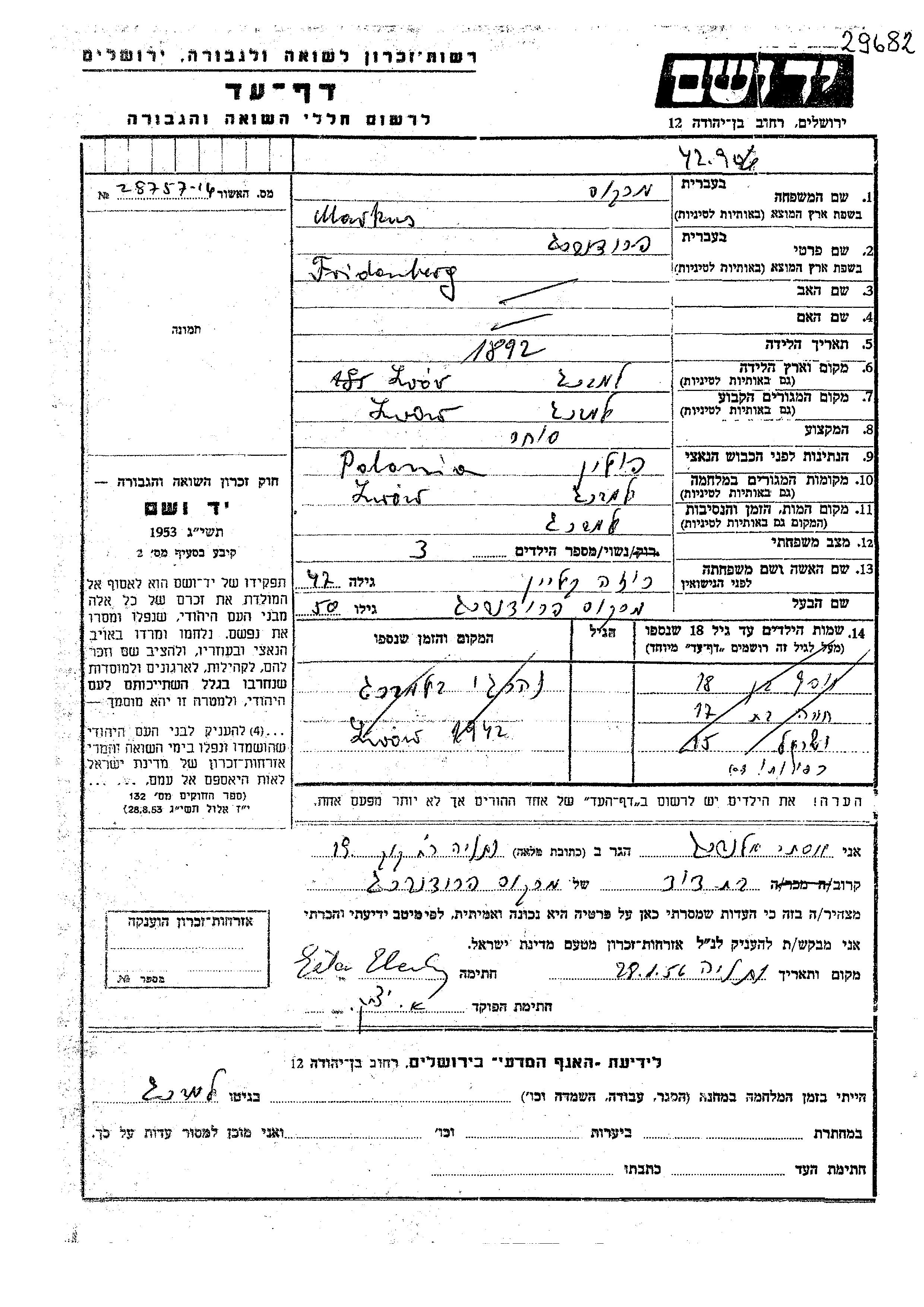 Markus Fridenberg wurde im Jahr 1892 in Lwow, Polen geboren. Er war Kaufmann/-frau und mit Roza, geb. Klein Verheiratet. Vor dem Zweiten Weltkrieg lebte er in Lwow, Polen. Während des Krieges war er in Lwow, Polen.