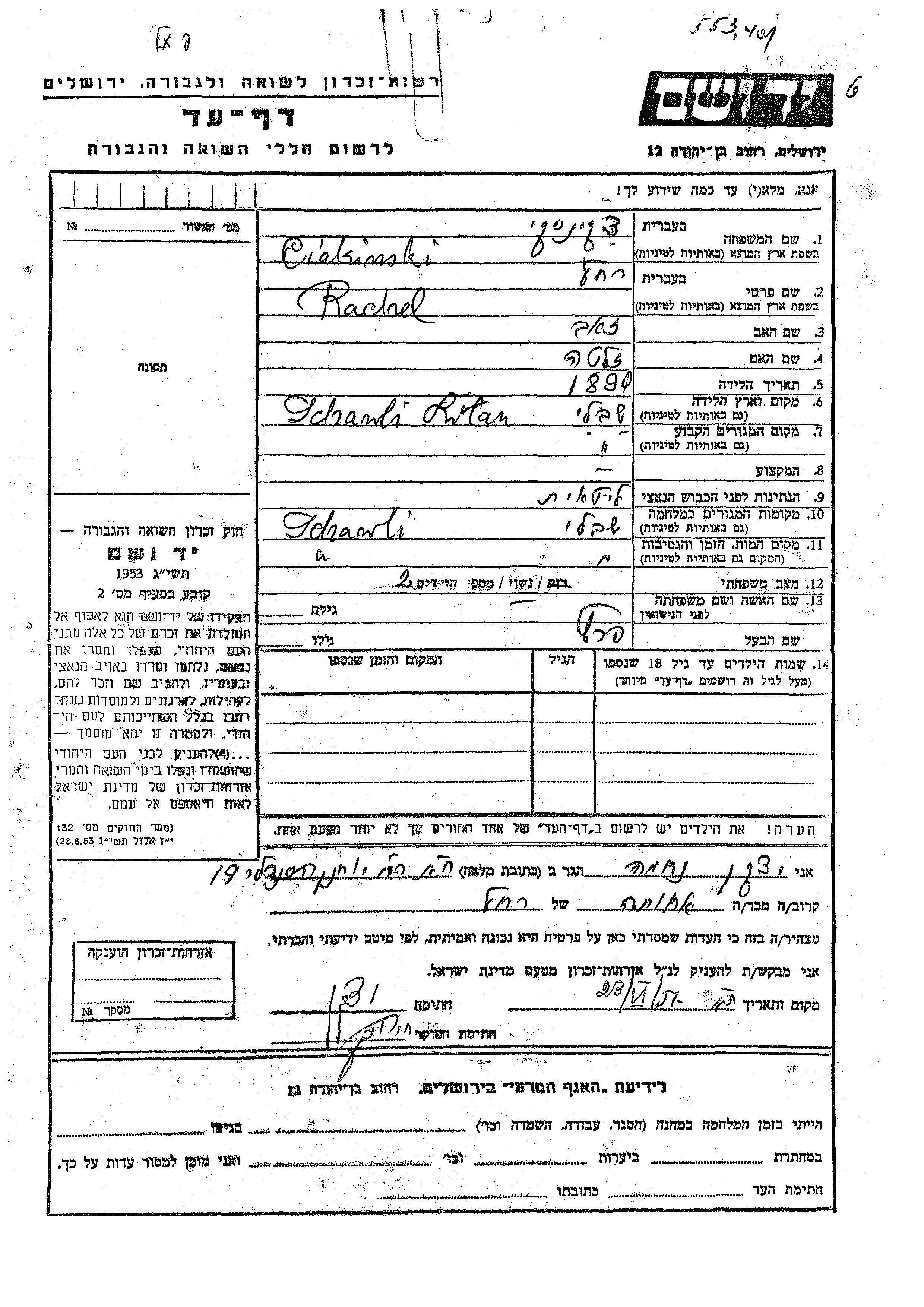Rachel Ciakinski wurde im Jahr 1890 in Schavli, Litauen geboren. Sie war die Tochter von Zeev und Zlata. Sie war mit Peretz Verheiratet. Während des Krieges war sie in Schavli, Litauen.