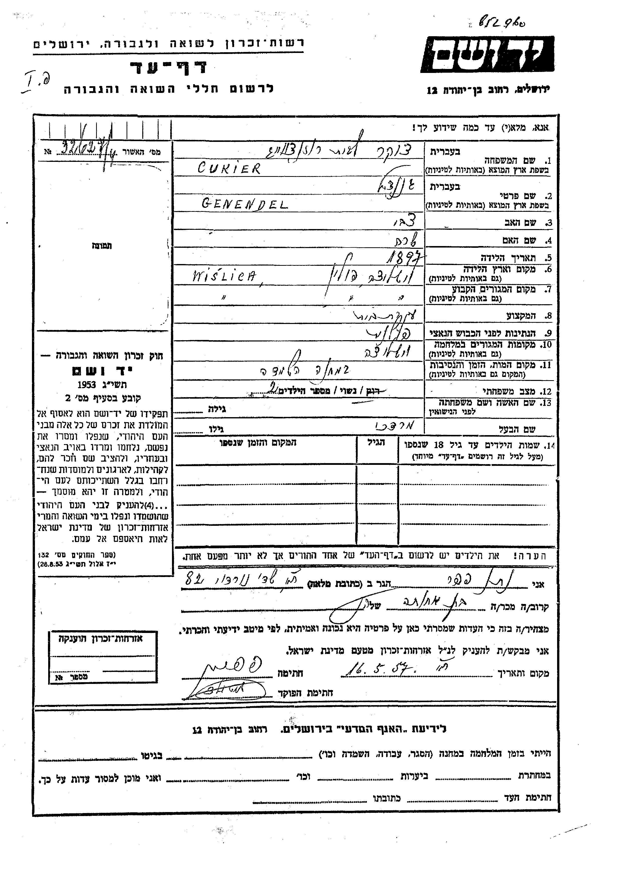 Genendel Cukier, geb. Rozentzveig wurde im Jahr 1897 in Wislica, Polen geboren. Sie war die Tochter von Tzvi und Sara. Sie war Hausfrau und mit Mordekhai Verheiratet. Vor dem Zweiten Weltkrieg lebte sie in Wislica, Polen. Während des Krieges war sie in Wislica, Polen.