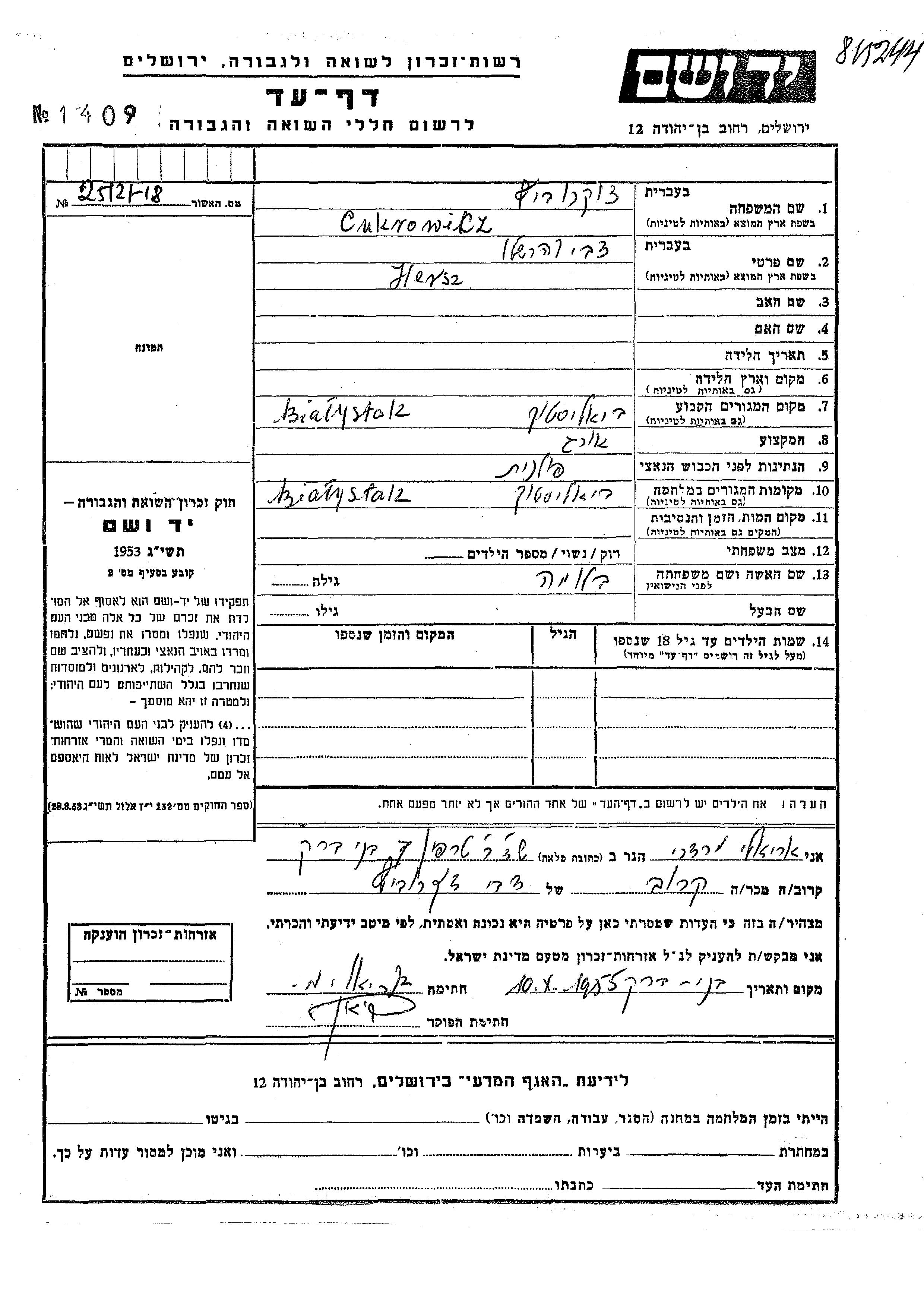 Cukrowicz Hersz Tzvi Bialystok, Polen Gedenkblatt