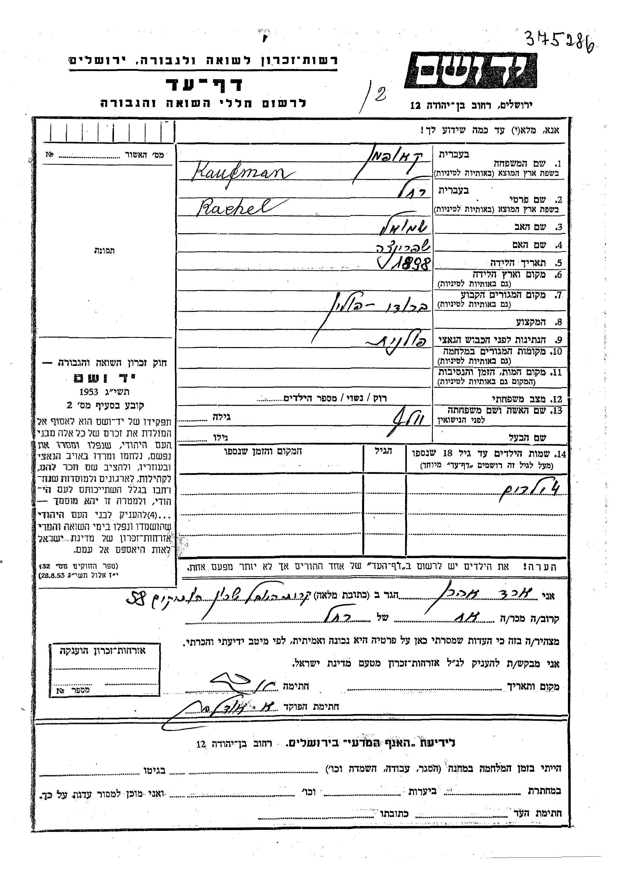Rachel Kaufman, geb. Volf wurde im Jahr 1898 geboren. Sie war die Tochter von Shmuel und Shprintza. Sie war Verheiratet. Vor dem Zweiten Weltkrieg lebte sie in Brody, Polen.