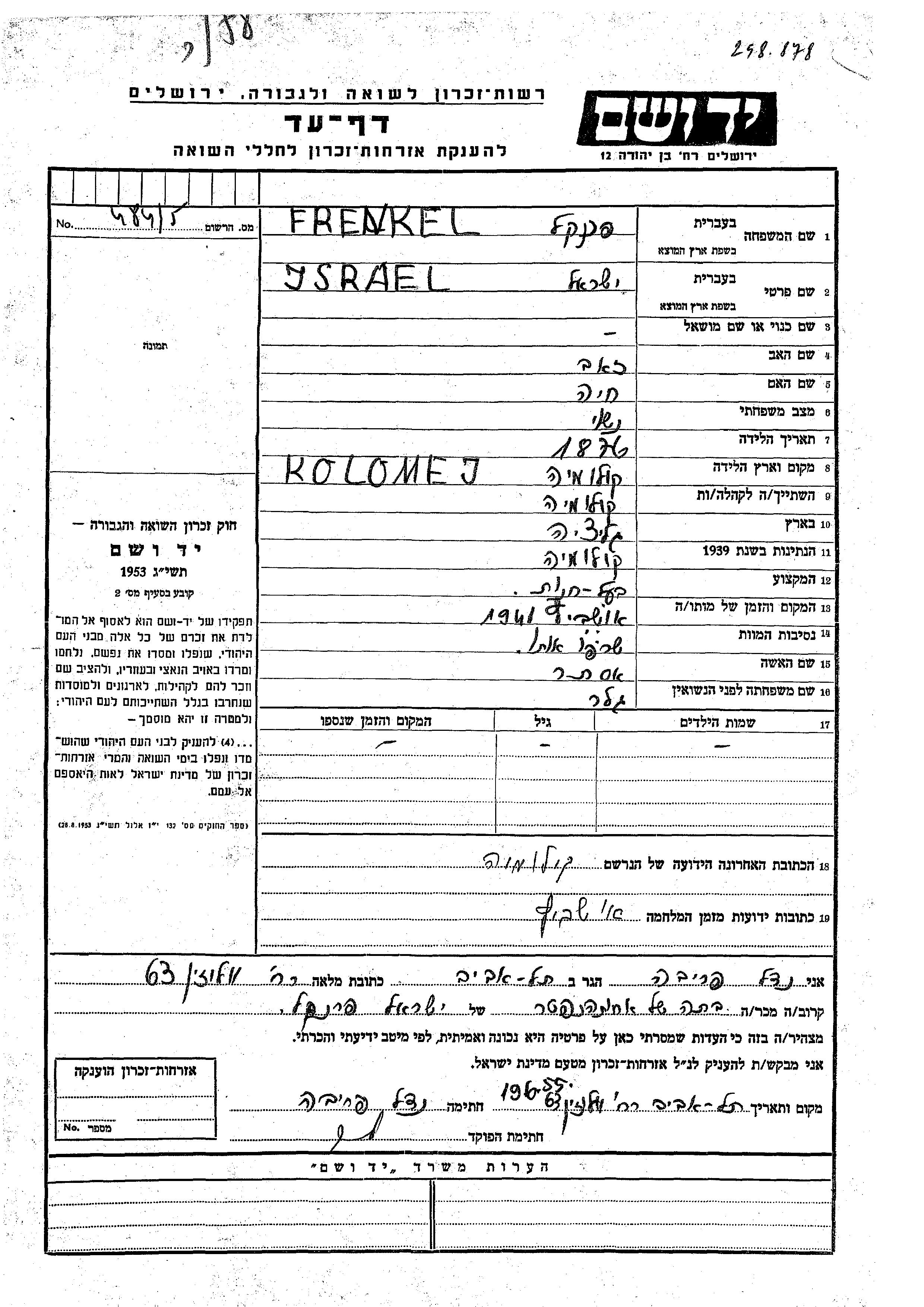 Ysrael Frenkel wurde im Jahr 1876 in Kolomey, Polen geboren. Er war der Sohn von Zeev und Khaia. Er war Ladenbesitzer/-in und mit Ester, geb. Geler Verheiratet. Vor dem Zweiten Weltkrieg lebte er in Kolomey, Polen. Während des Krieges war er in Auschwitz, Polen.