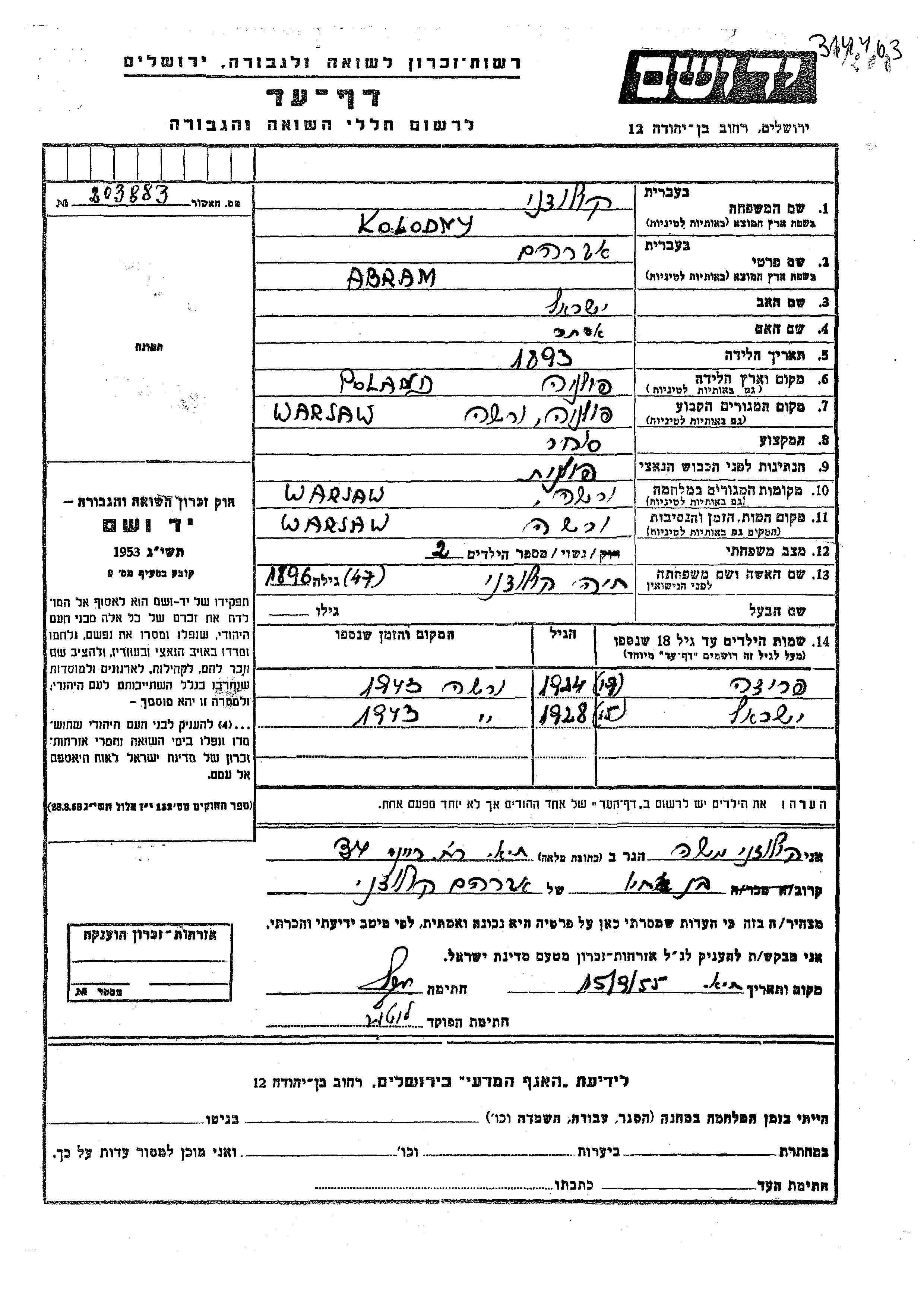 Abram wurde in der Schoah ermordet. Todesort: Warsaw, Polen.