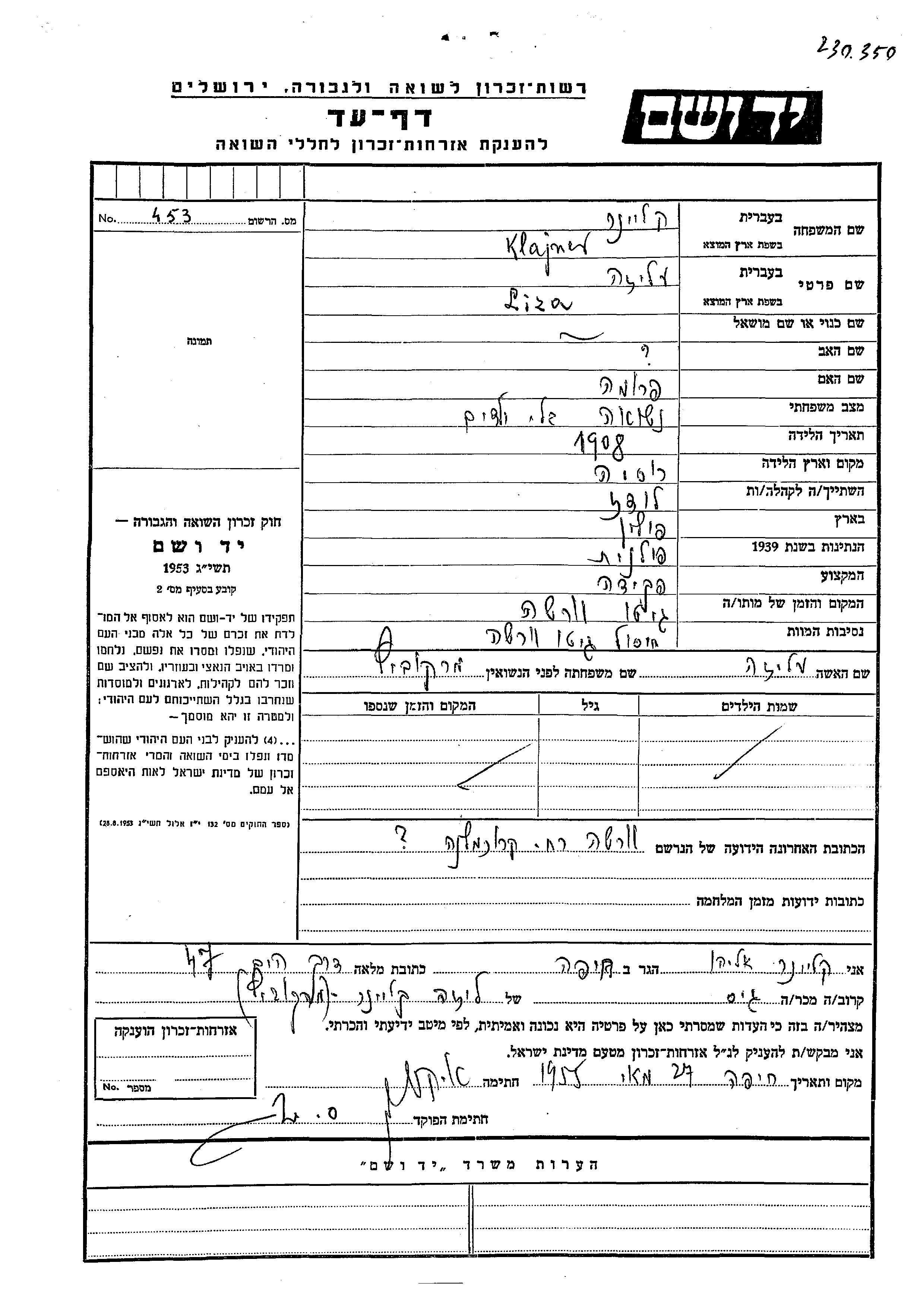 Liza Aliza Klajner, geb. Markovitz wurde im Jahr 1908 in Russland (UdSSR) geboren. Sie war die Tochter von Fruma. Sie war Angestellte/-r und Verheiratet. Während des Krieges war sie in Warszawa, Polen.