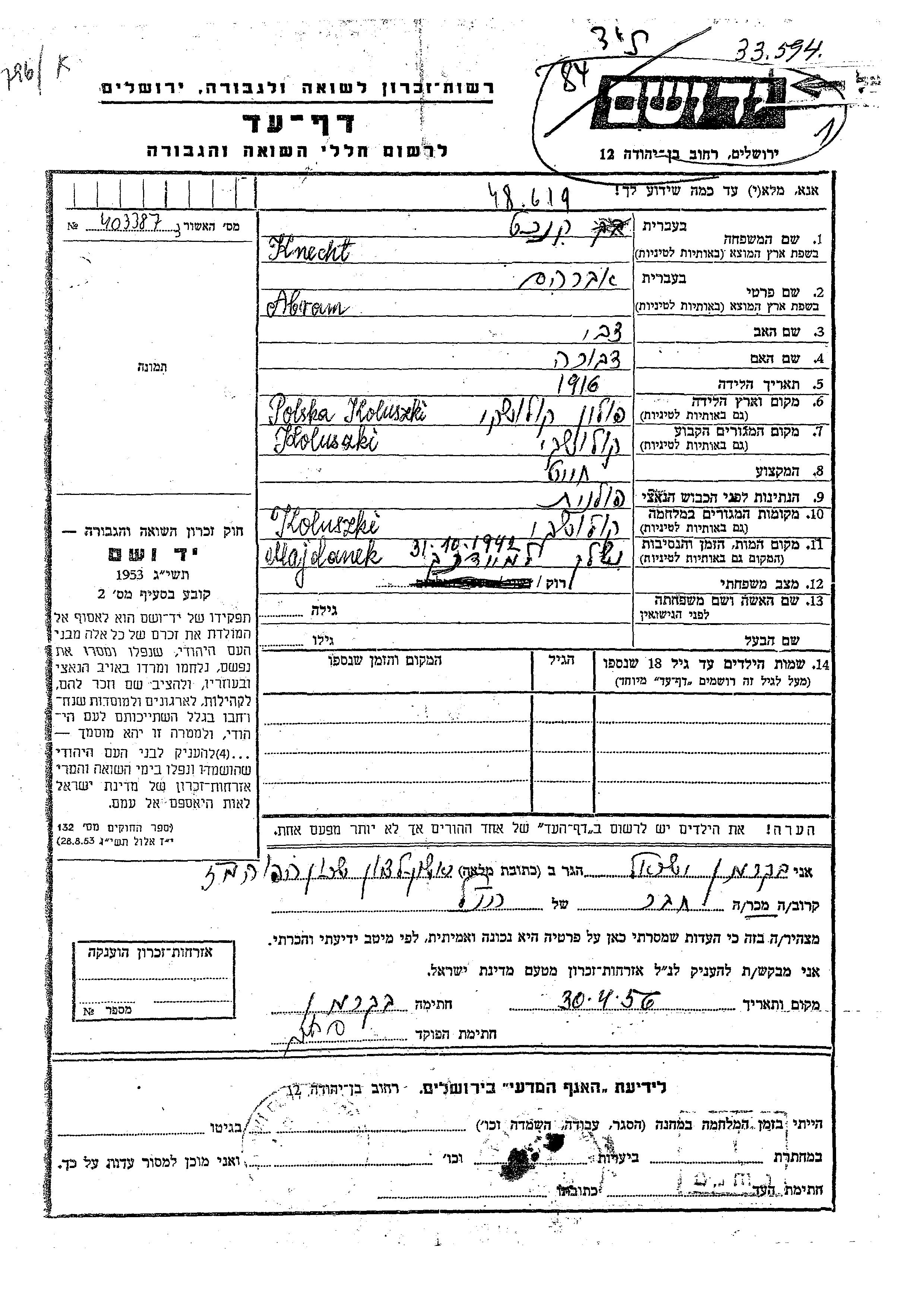Abram Knecht wurde im Jahr 1916 in Koluszki, Polen geboren. Er war der Sohn von Tzvi und Dvora. Er war Schneider und Ledig. Vor dem Zweiten Weltkrieg lebte er in Koluszki, Polen. Während des Krieges war er in Koluszki, Polen.