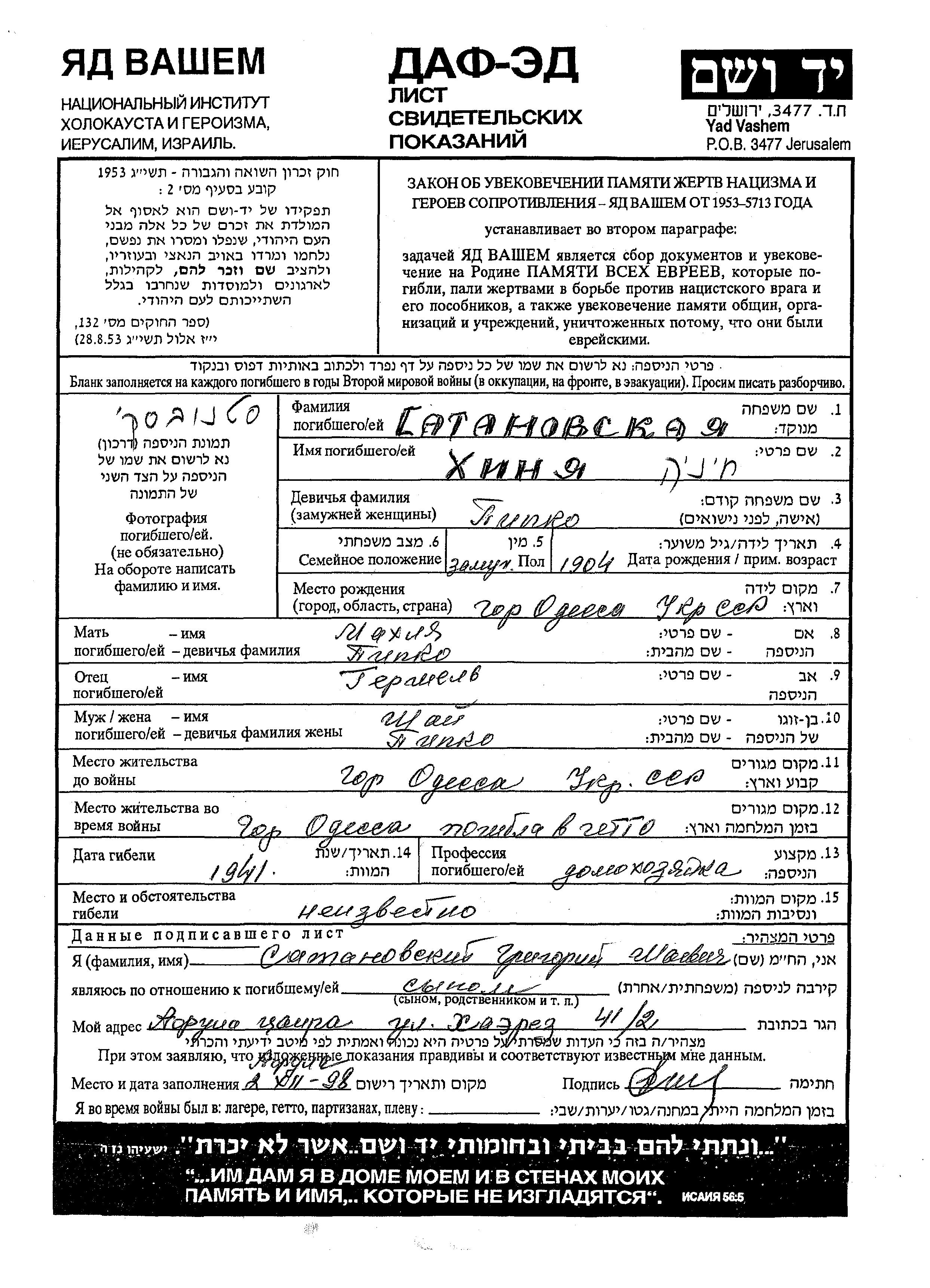 Khinya wurde in der Schoah ermordet. Todesort: Odessa, Ukraine (UdSSR) im Jahr 1941.