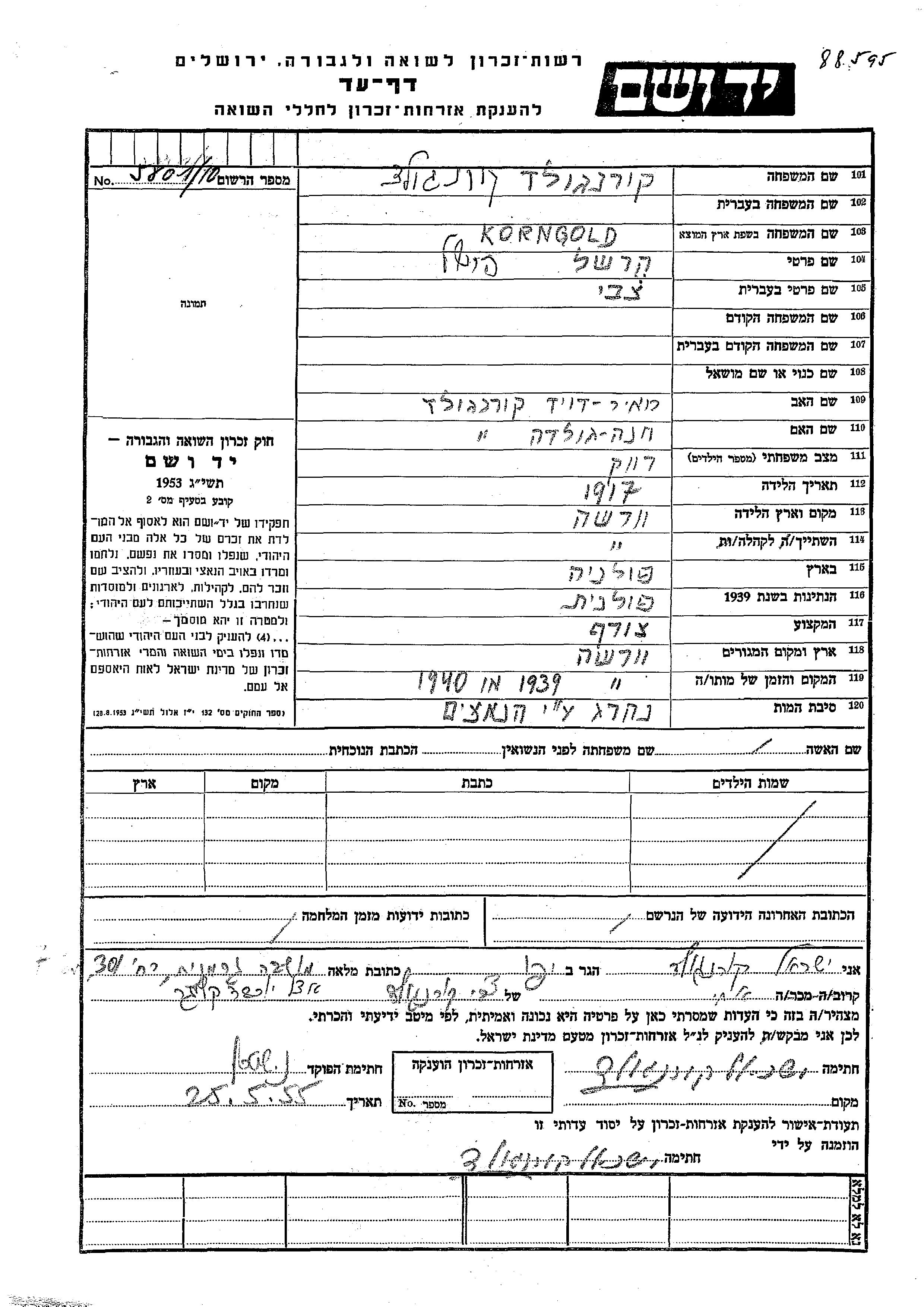 Hershel Tzvi Korngold wurde im Jahr 1917 in Warszawa, Polen geboren. Er war der Sohn von Meir David und Khana Golda. Er war Goldschmied/-in und Ledig. Vor dem Zweiten Weltkrieg lebte er in Warszawa, Polen. Während des Krieges war er in Warszawa, Polen.
