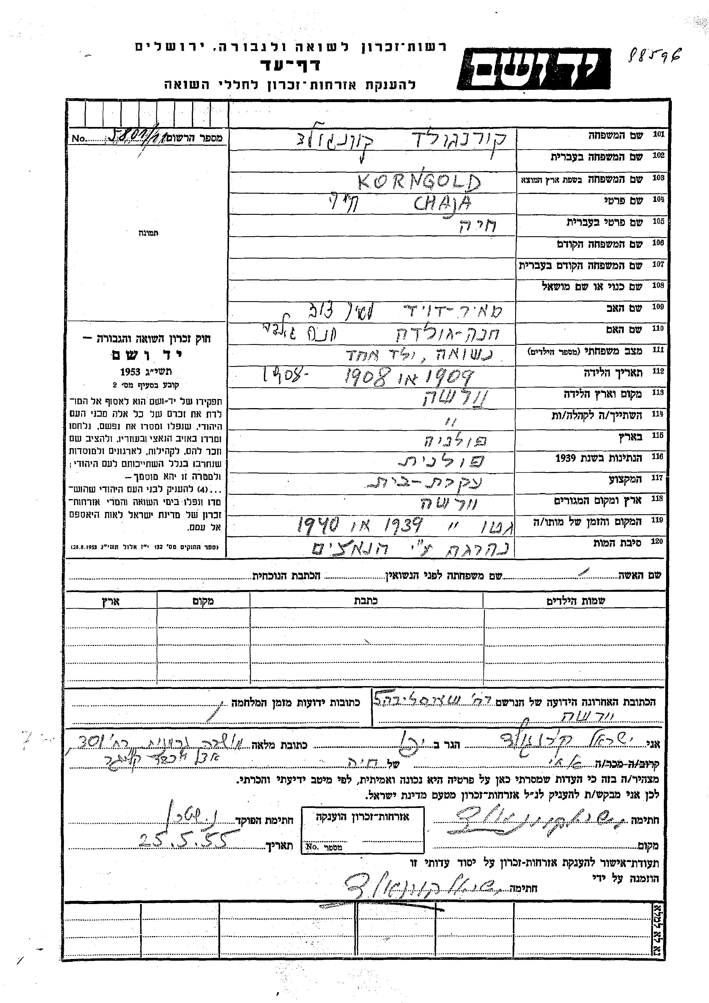 Chaja Korngold wurde im Jahr 1908 in Warszawa, Polen geboren. Sie war die Tochter von Meir David und Khana Golda. Sie war Hausfrau und Verheiratet. Während des Krieges war sie in Warszawa, Polen.