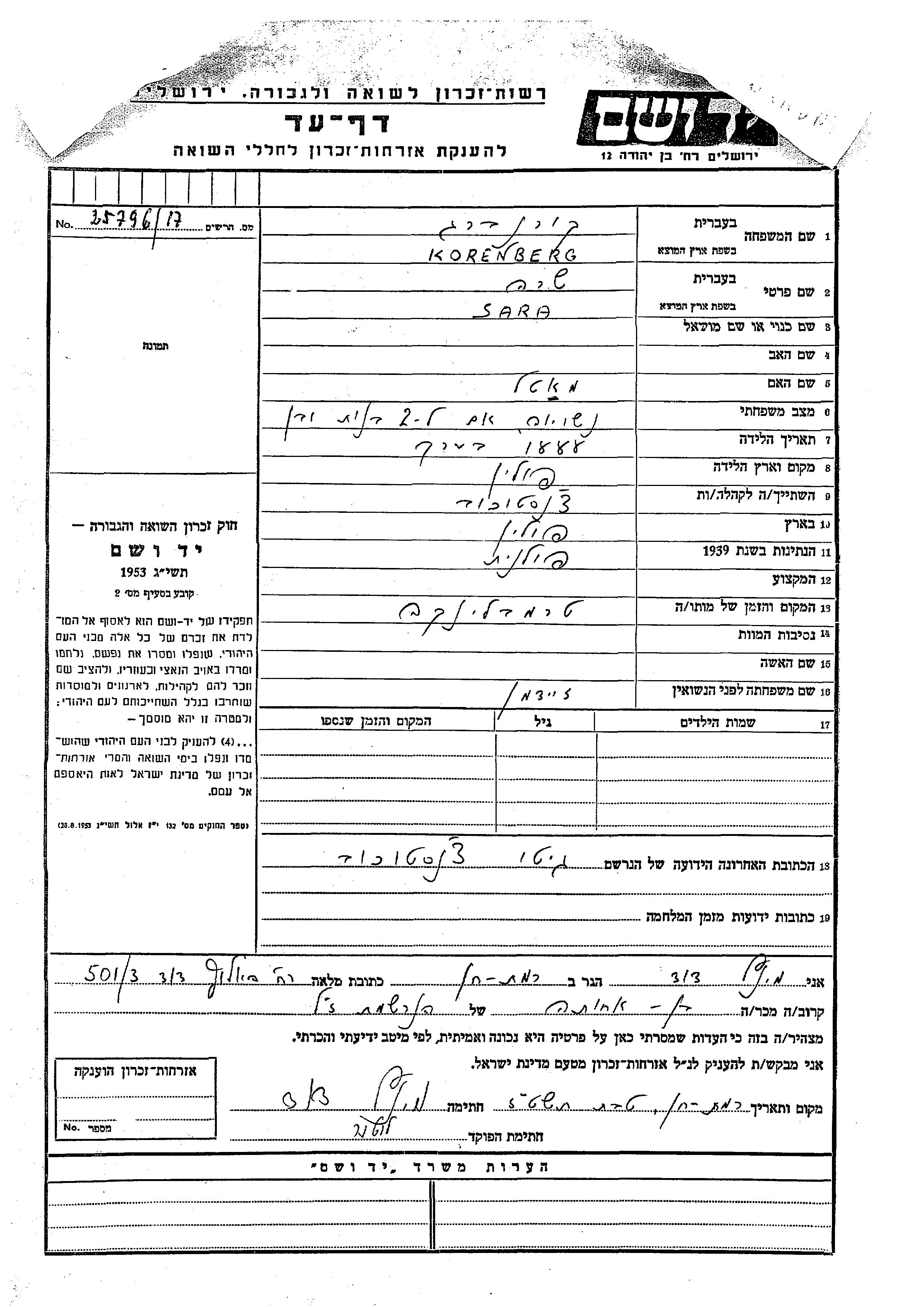 Sara Korenberg, geb. Zeidman wurde im Jahr 1888 in Polen geboren. Sie war die Tochter von Matl. Während des Krieges war sie in Czestochowa, Polen.