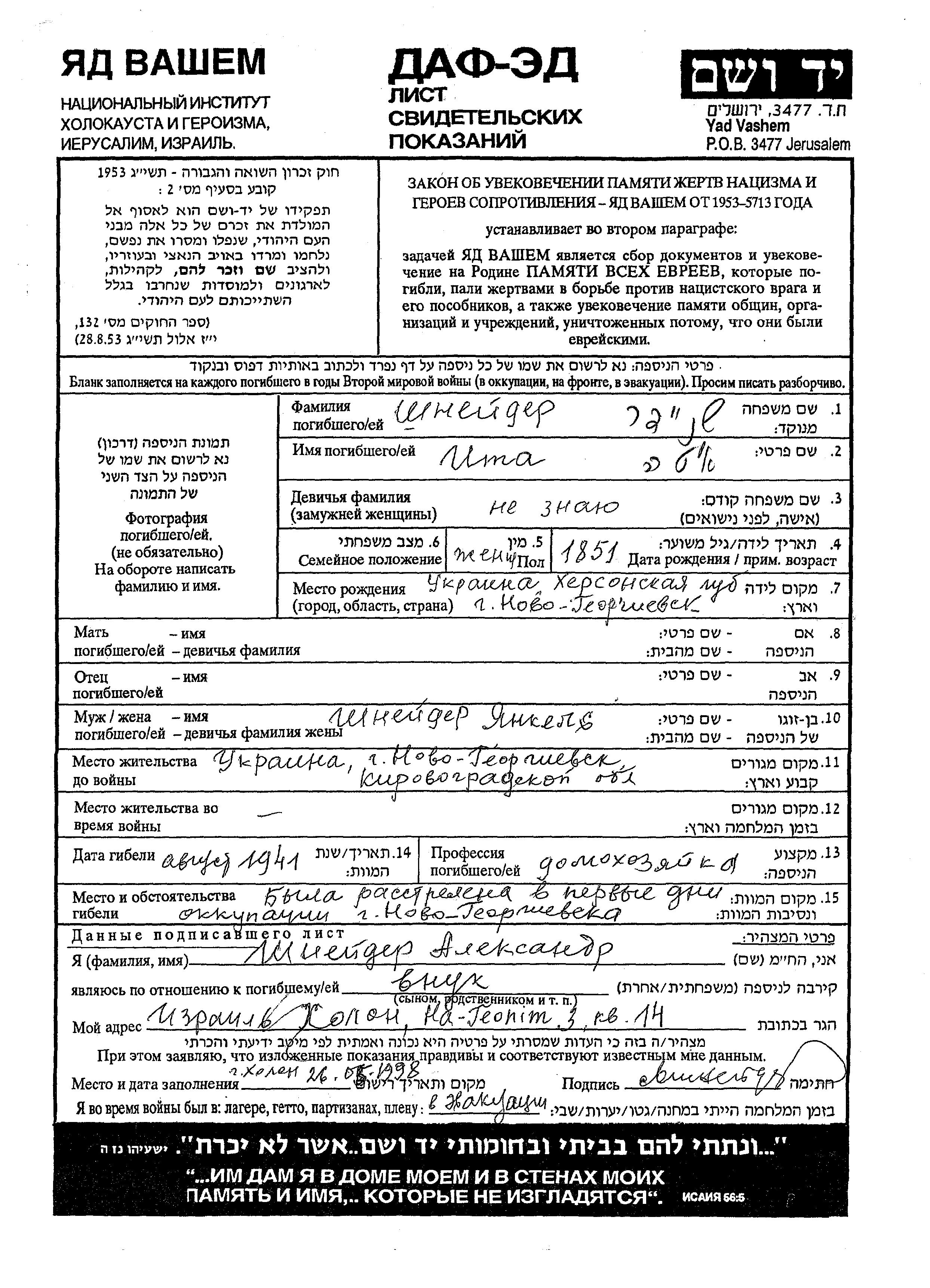 Ita Shneider wurde im Jahr 1851 in Novo Georgijevsk, Ukraine (UdSSR) geboren. Sie war Hausfrau und mit Yankel Verheiratet. Vor dem Zweiten Weltkrieg lebte sie in Novo Georgijevsk, Ukraine (UdSSR).