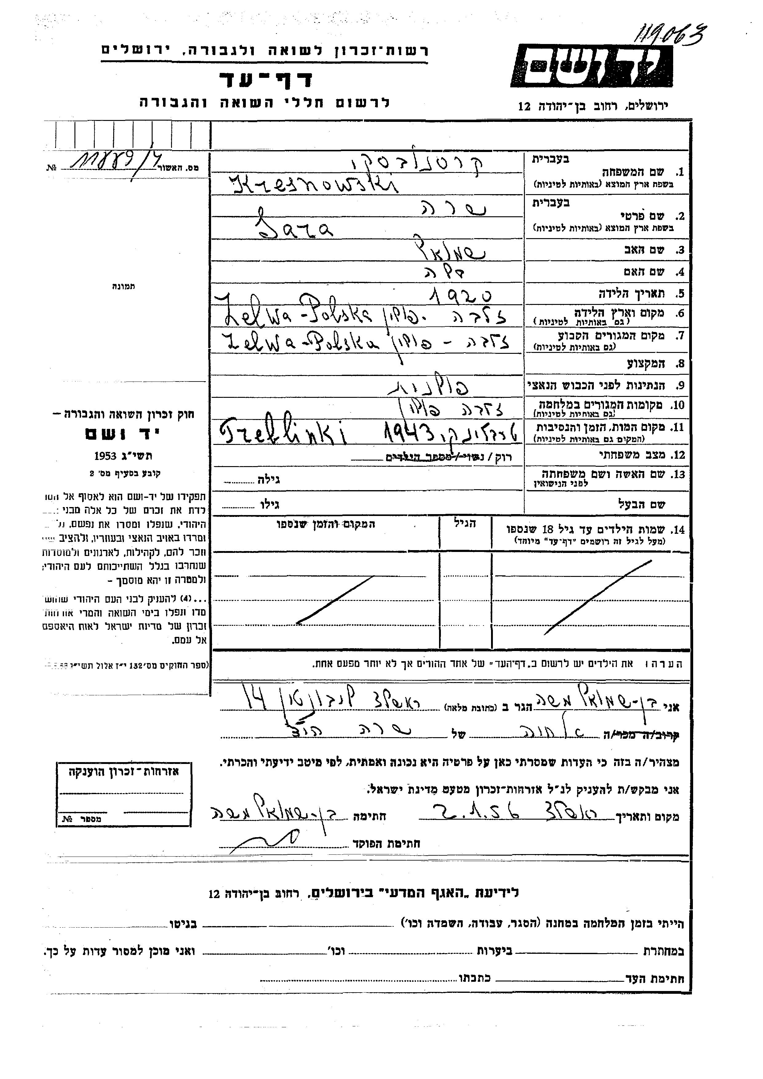 Sara Kresnowski wurde im Jahr 1920 in Zelwa, Polen geboren. Sie war die Tochter von Shmuel und Bela. Sie war Ledig. Vor dem Zweiten Weltkrieg lebte sie in Zelwa, Polen. Während des Krieges war sie in Zelwa, Polen.