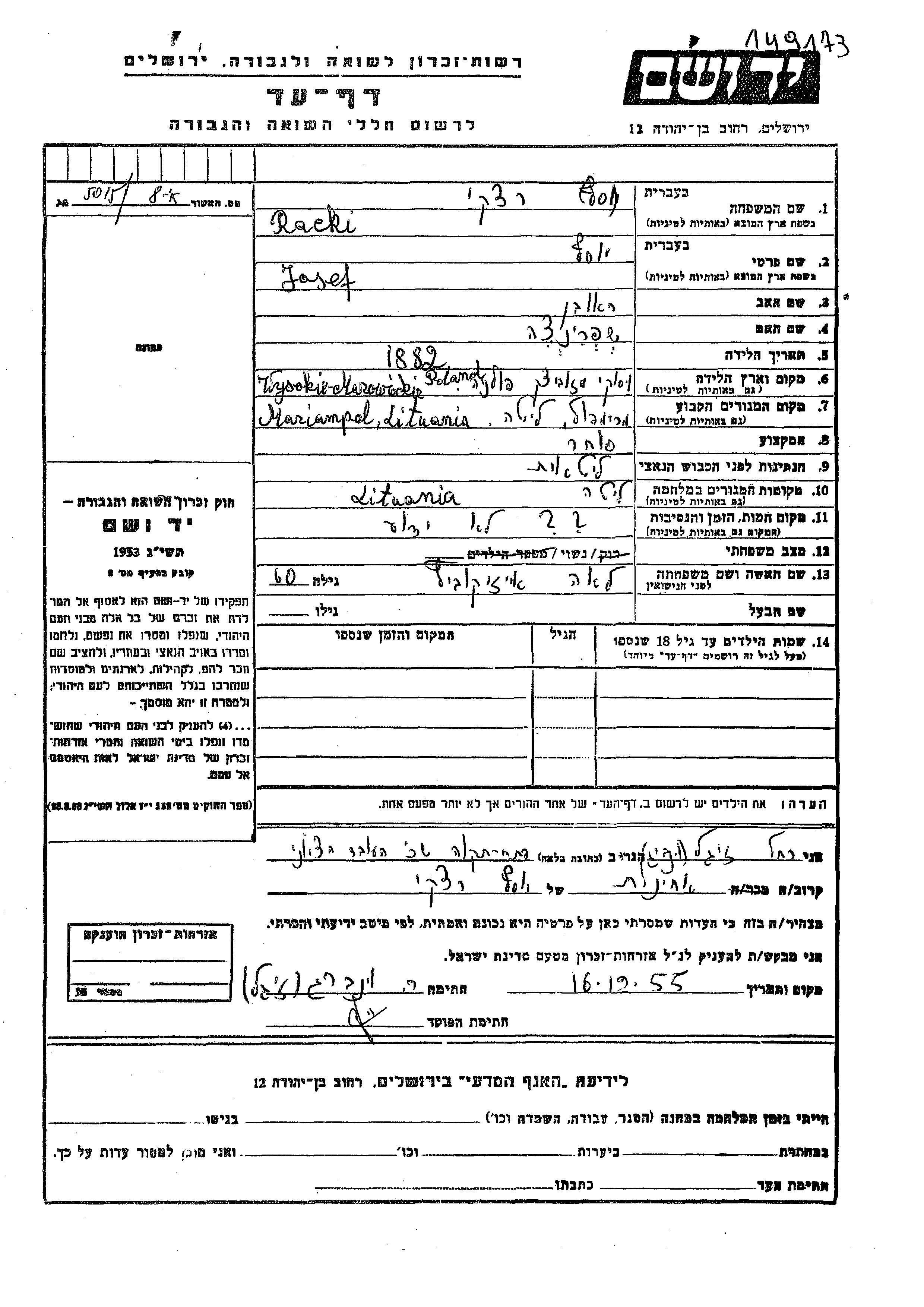 Josef Racki wurde im Jahr 1882 in Wysokie Mazowieckie, Polen geboren. Er war der Sohn von Reuven und Shprintza. Er war Kaufmann/-frau und mit Lea, geb. Eizikovitz Verheiratet. Vor dem Zweiten Weltkrieg lebte er in Mariampol, Litauen. Während des Krieges war er in Litauen.