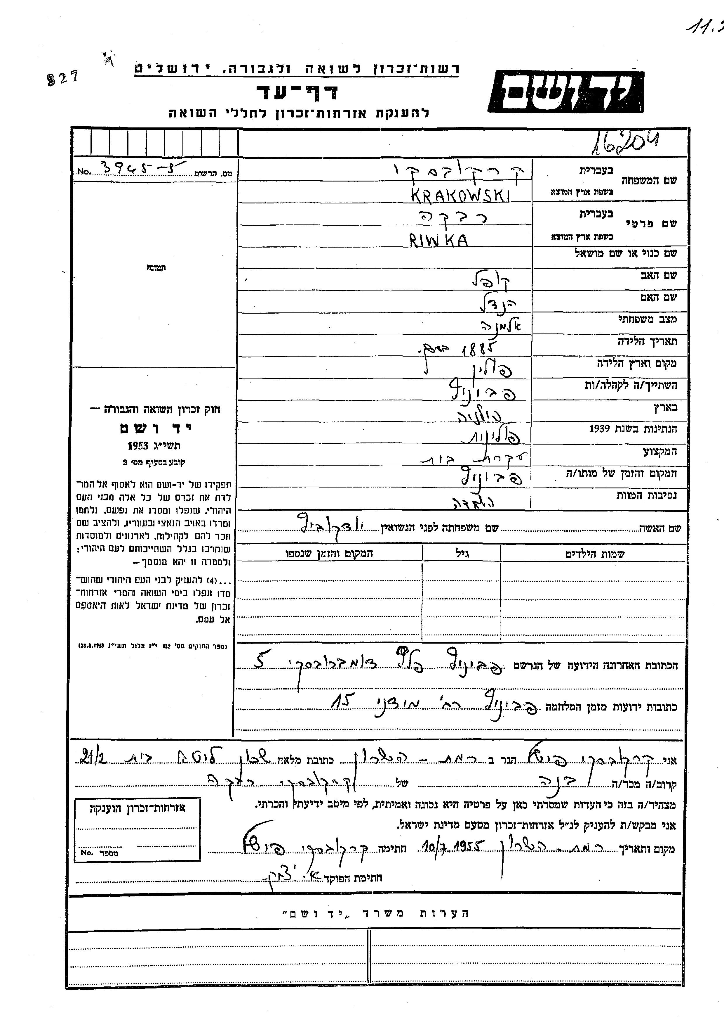Riwka Krakowski, geb. Iudkovitz wurde im Jahr 1885 in Polen geboren. Sie war die Tochter von Kopel und Hendel. Sie war Hausfrau und Witwe. Vor dem Zweiten Weltkrieg lebte sie in Pabjanice, Polen. Während des Krieges war sie in Pabjanice, Polen.