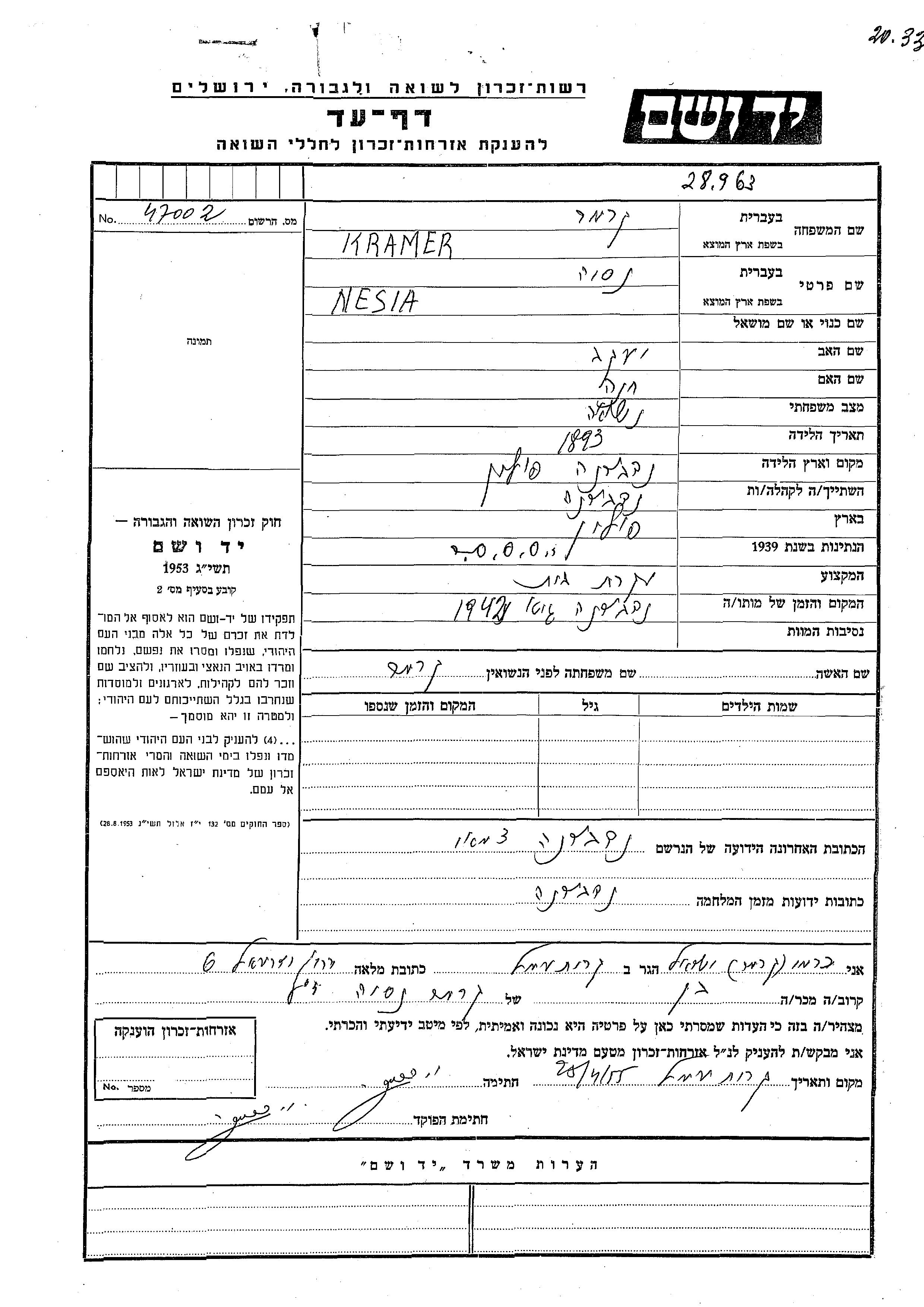 Nesia Kramer wurde im Jahr 1893 in Nadworna, Polen geboren. Sie war die Tochter von Yaakov und Khana. Sie war Hausfrau. Vor dem Zweiten Weltkrieg lebte sie in Nadworna, Polen. Während des Krieges war sie in Nadworna, Polen.