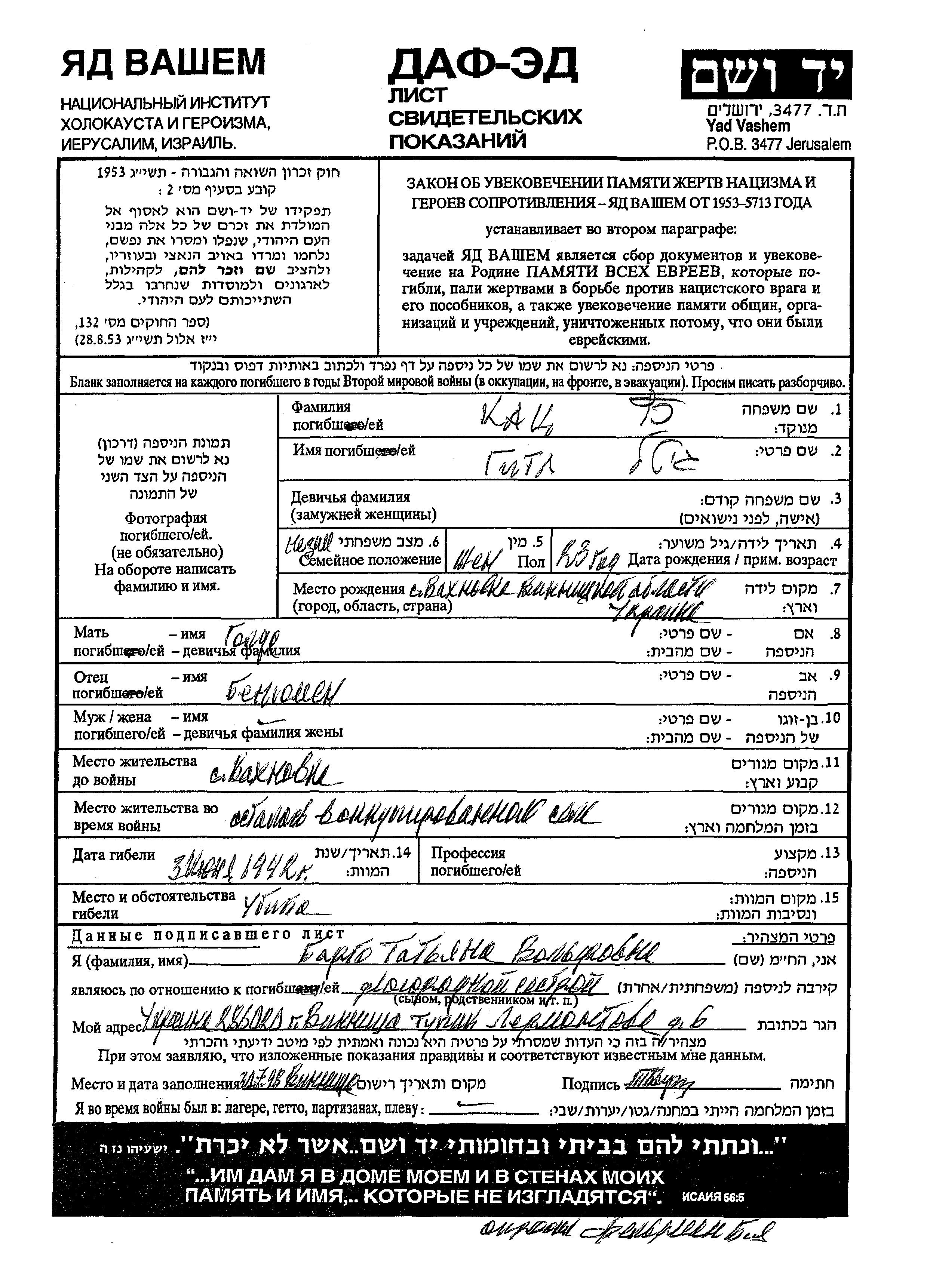 Katz Gitl Vakhnovka, Ukraine (UdSSR) Gedenkblatt