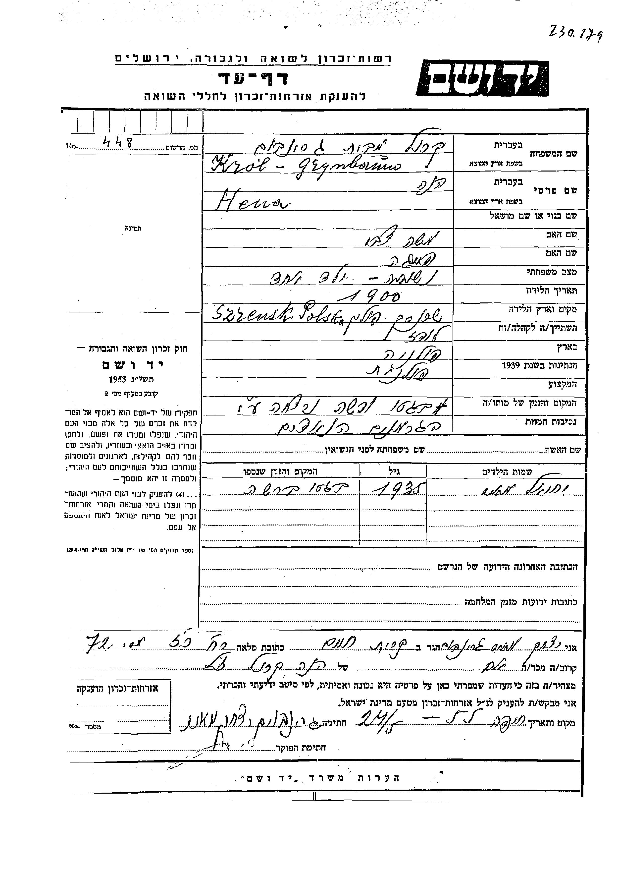 Hena Krol, geb. Grynbaum wurde im Jahr 1900 in Szrensk, Polen geboren. Sie war die Tochter von Moshe Tzvi und Feiga. Sie war Verheiratet. Vor dem Zweiten Weltkrieg lebte sie in Lodz, Polen.