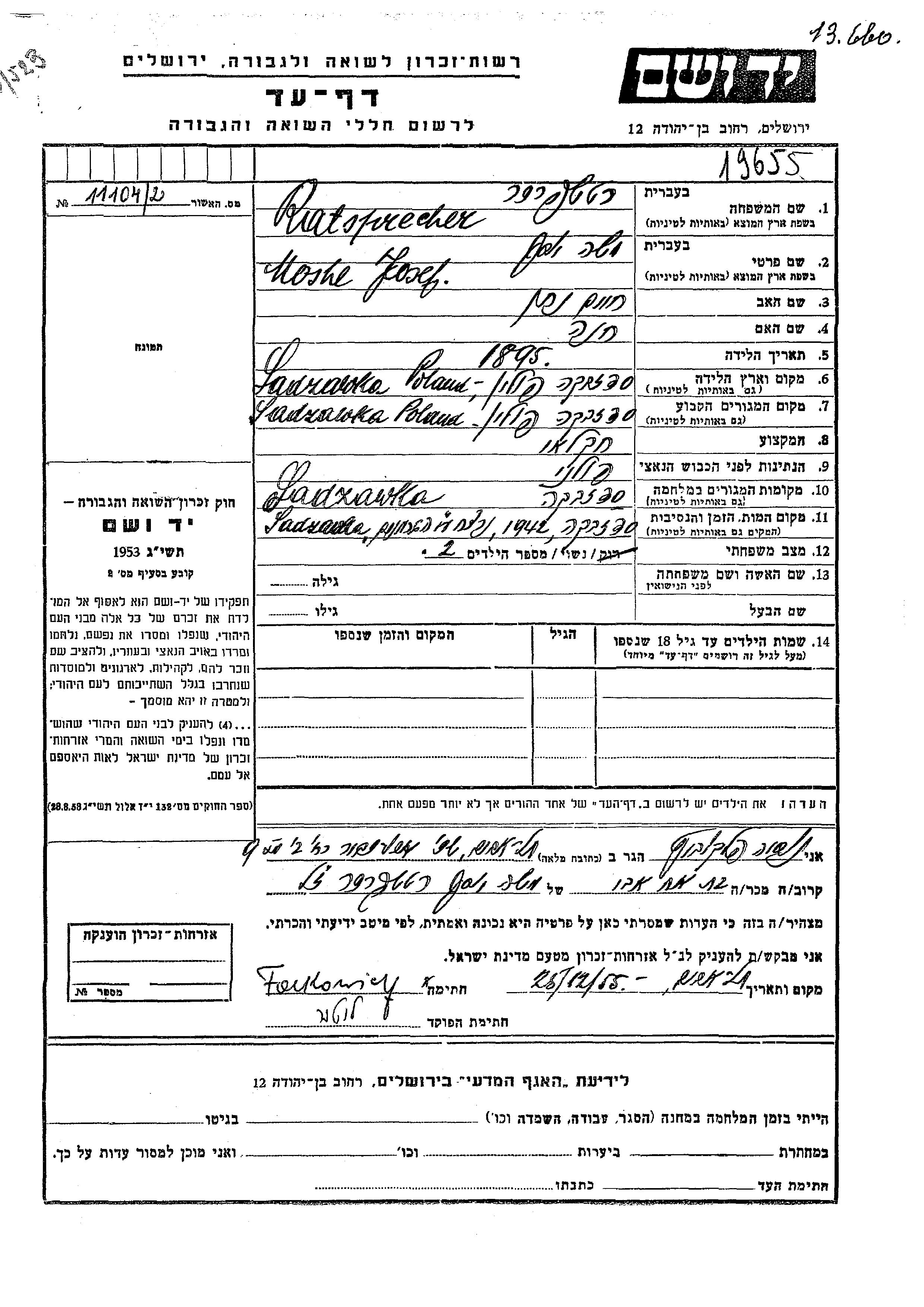 Josef Moshe Ratsprecher wurde im Jahr 1895 in Sadzawka, Polen geboren. Er war der Sohn von Khaim Natan und Khana. Er war Landwirt und Verheiratet. Vor dem Zweiten Weltkrieg lebte er in Sadzawka, Polen. Während des Krieges war er in Sadzawka, Polen.