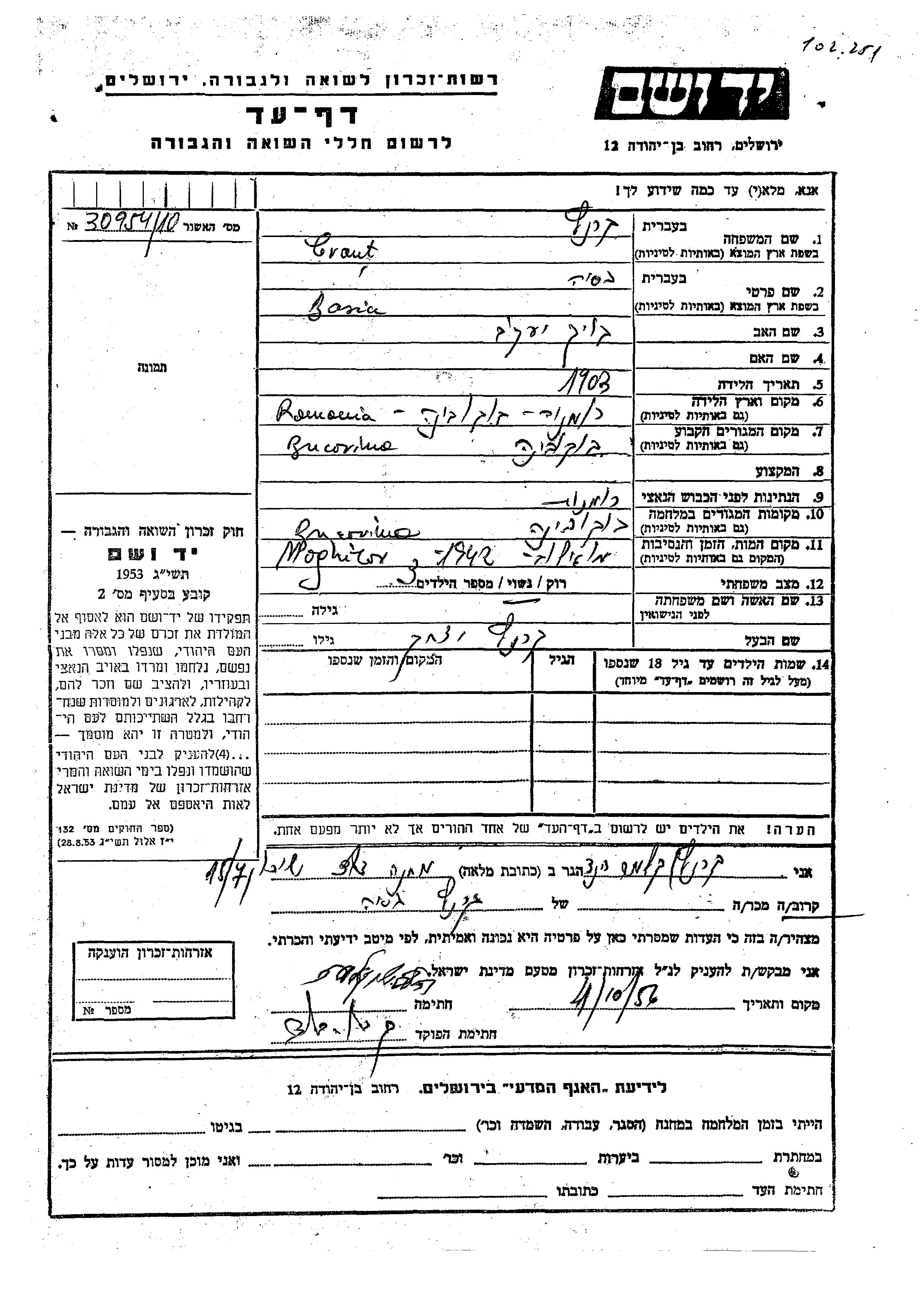 Basia Crant, geb. Kalik wurde im Jahr 1903 in Bukovina, Rumänien geboren. Sie war die Tochter von Yaakov. Sie war mit Yitzkhak Verheiratet. Vor dem Zweiten Weltkrieg lebte sie in Bukovina, Rumänien. Während des Krieges war sie in Bukovina, Rumänien.