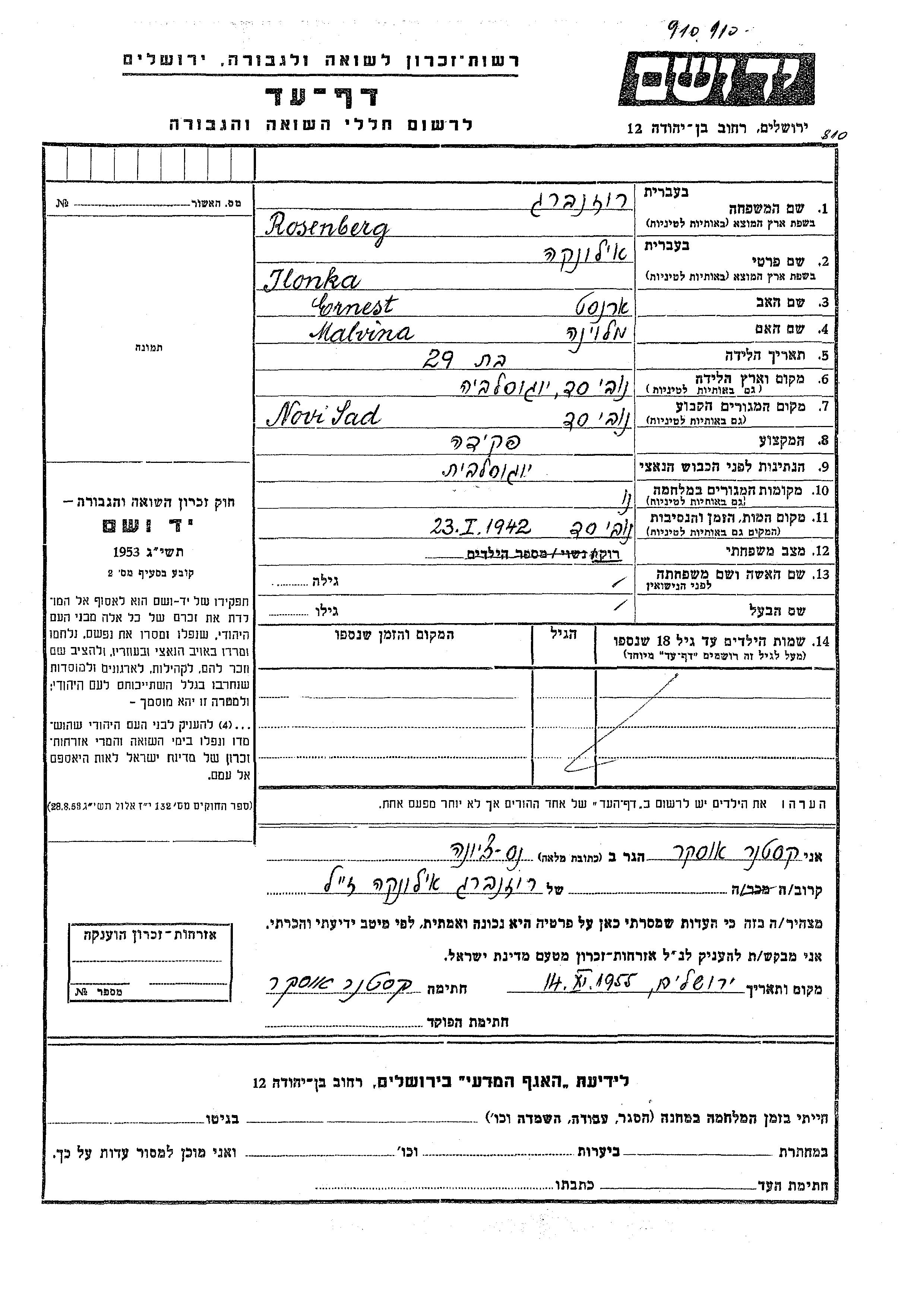 Ilonka Rosenberg wurde in Novi Sad, Jugoslawien geboren. Sie war die Tochter von Ernest und Malvina. Sie war Angestellte/-r und Ledig. Vor dem Zweiten Weltkrieg lebte sie in Novi Sad, Jugoslawien.