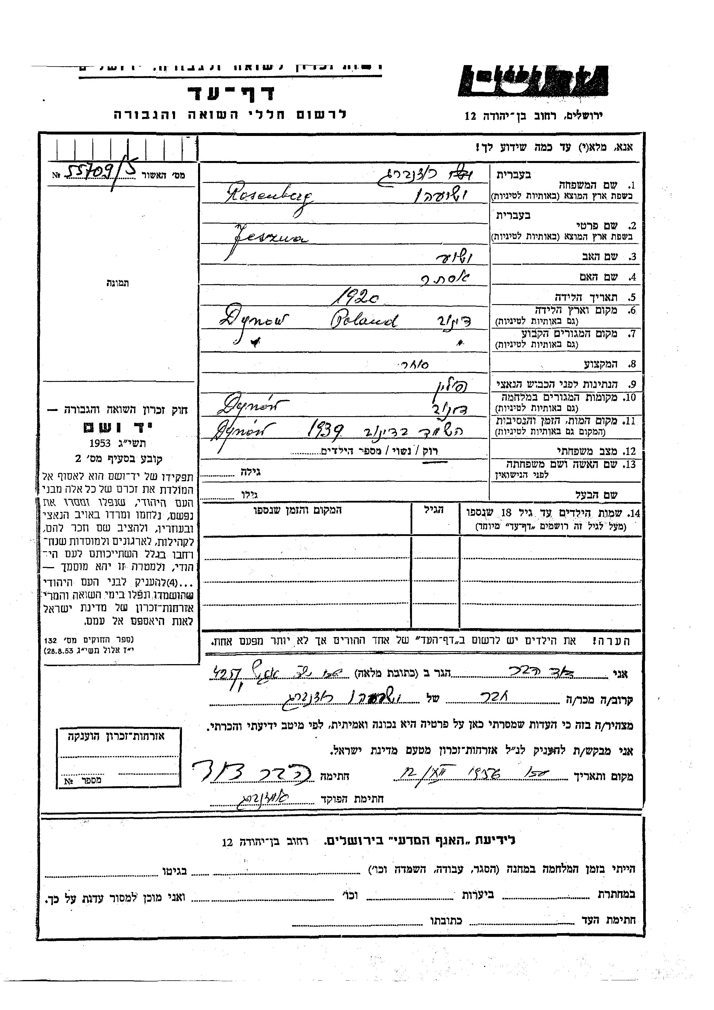 Jeszua Ishiyahu Rosenberg wurde im Jahr 1920 in Dynow, Polen geboren. Er war der Sohn von Yehoshua und Ester. Er war Kaufmann/-frau und Ledig. Vor dem Zweiten Weltkrieg lebte er in Dynow, Polen. Während des Krieges war er in Dynow, Polen.