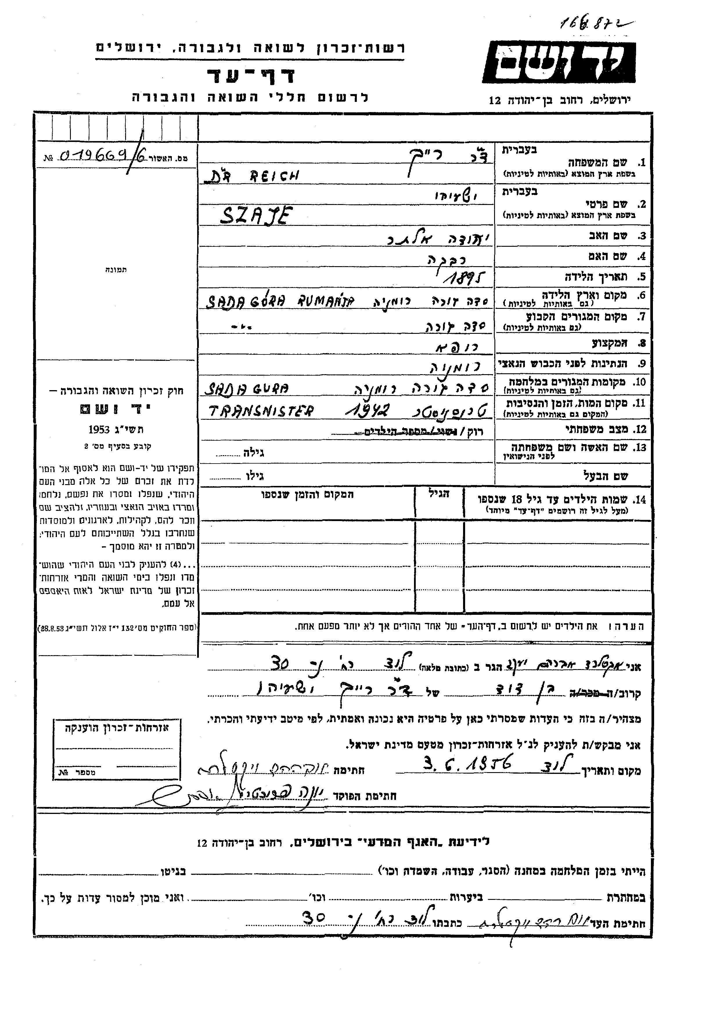 Dr. Szaje Reich wurde im Jahr 1895 in Sadagora, Rumänien geboren. Er war der Sohn von Yehuda Alter und Rivka. Er war Arzt/ärztin und Ledig. Vor dem Zweiten Weltkrieg lebte er in Sadagora, Rumänien. Während des Krieges war er in Sadagora, Rumänien.