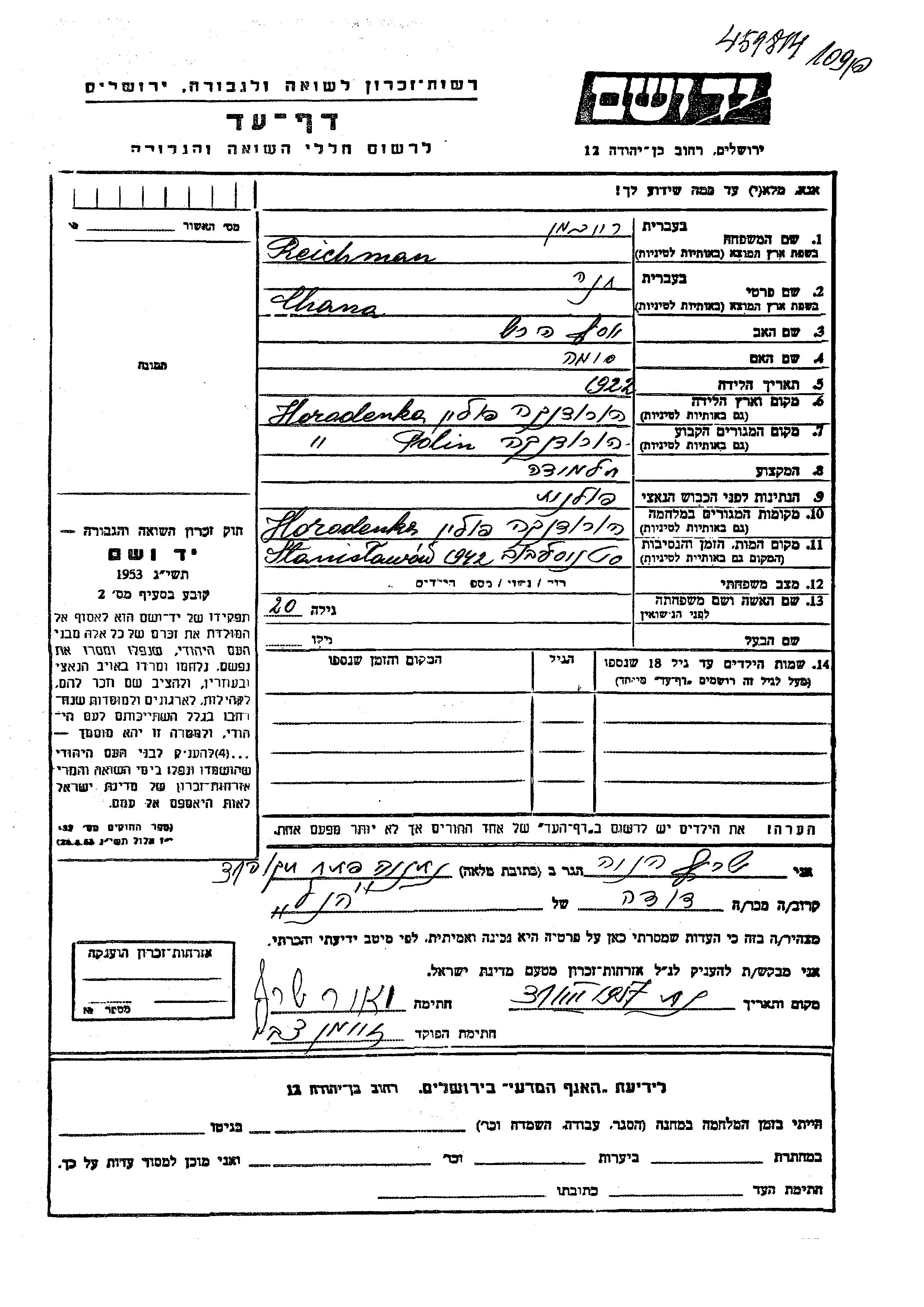 Chana Reichman wurde im Jahr 1922 in Horodenka, Polen geboren. Sie war die Tochter von Yosef Hersh und Sima. Sie war Schüler/-in. Vor dem Zweiten Weltkrieg lebte sie in Horodenka, Polen. Während des Krieges war sie in Horodenka, Polen.