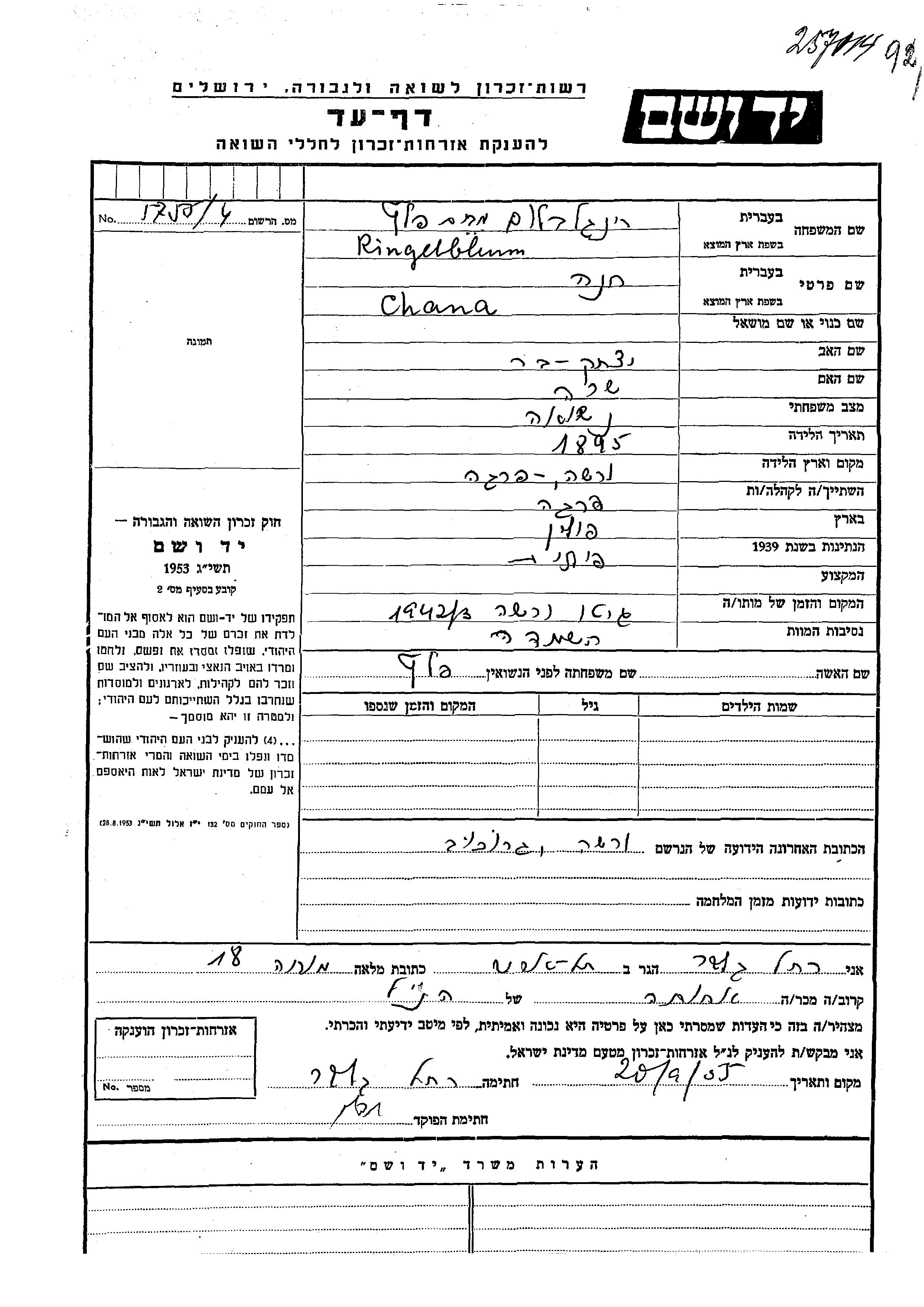 Chana wurde in der Schoah ermordet. Todesort: Warsaw, Polen im Jahr 1942.