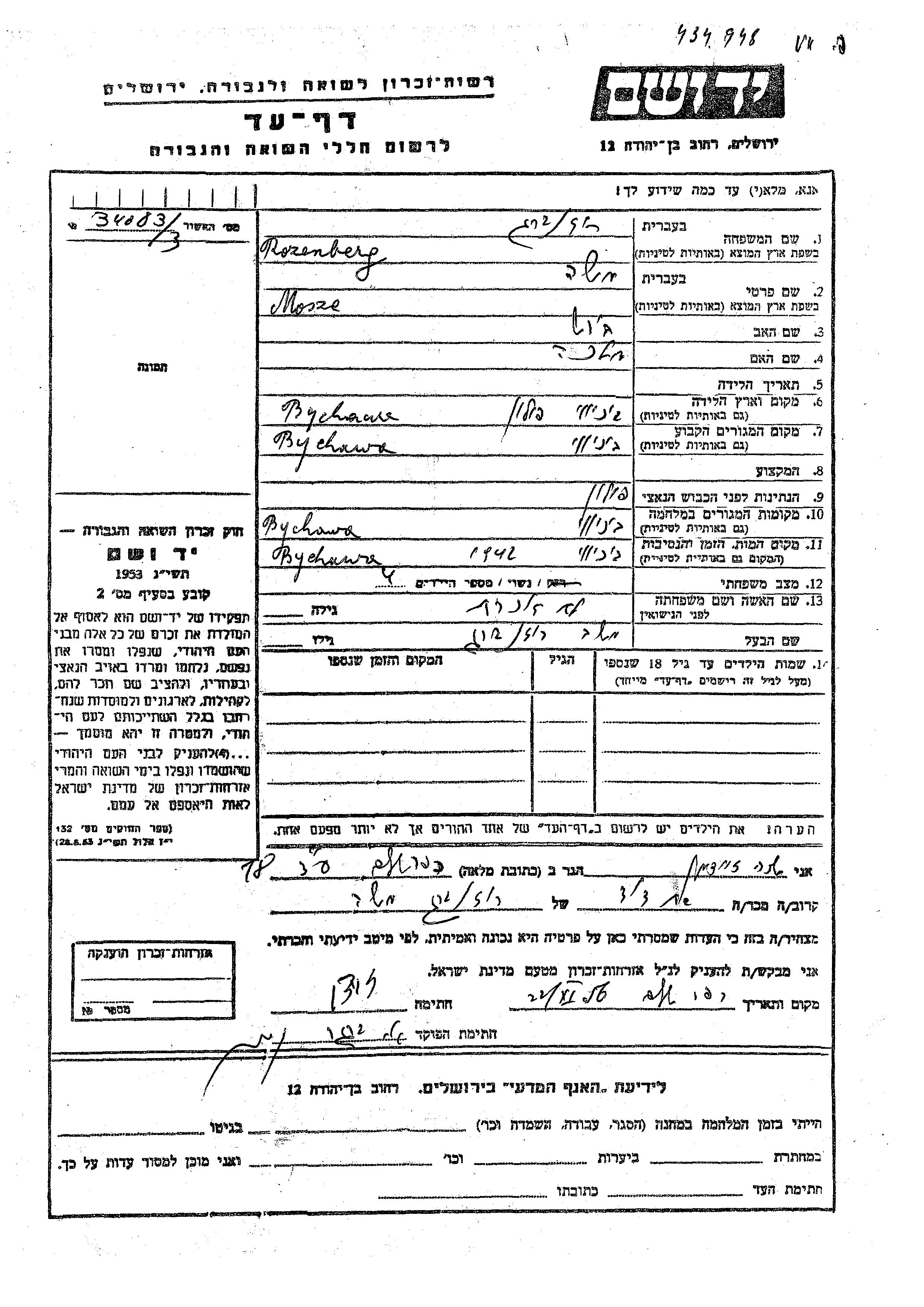 Mosze Rozenberg wurde in Bychawa, Polen geboren. Er war der Sohn von Hirsh und Malka. Er war Verheiratet. Vor dem Zweiten Weltkrieg lebte er in Bychawa, Polen. Während des Krieges war er in Bychawa, Polen.