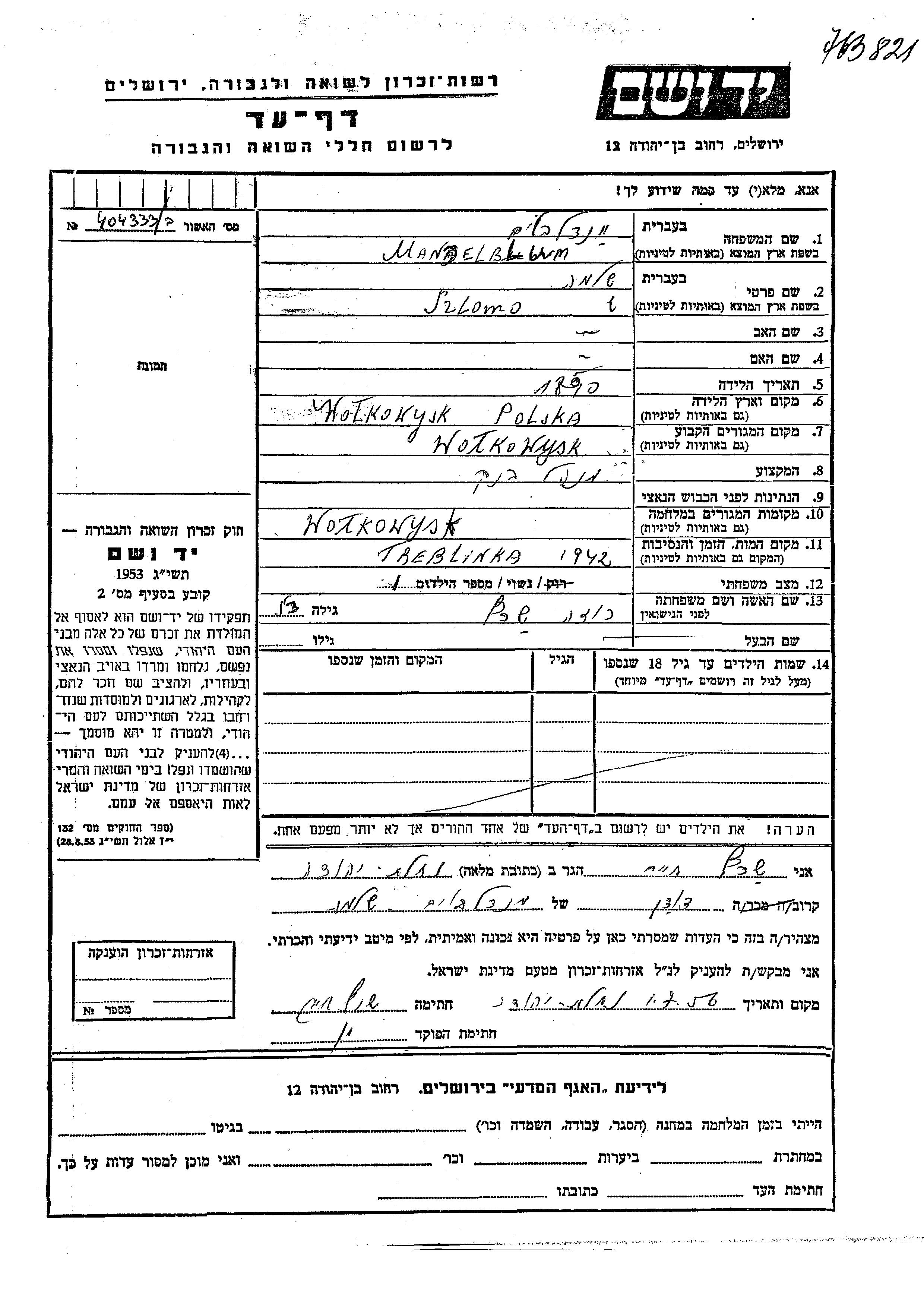 Szlomo Mandelblum wurde im Jahr 1890 in Wolkowysk, Polen geboren. Er war Bankdirektor und mit Roza, geb. Shertz Verheiratet. Vor dem Zweiten Weltkrieg lebte er in Wolkowysk, Polen. Während des Krieges war er in Wolkowysk, Polen.