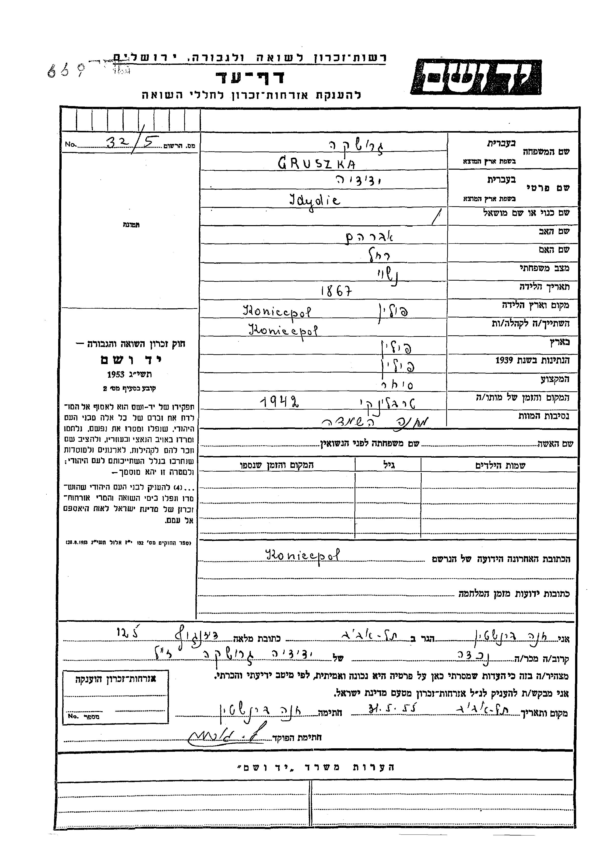 Idydie Gruszka wurde im Jahr 1867 in Koniecpol, Polen geboren. Er war der Sohn von Avraham und Rakhel. Er war Kaufmann/-frau und Verheiratet. Vor dem Zweiten Weltkrieg lebte er in Koniecpol, Polen. Während des Krieges war er in Koniecpol, Polen.