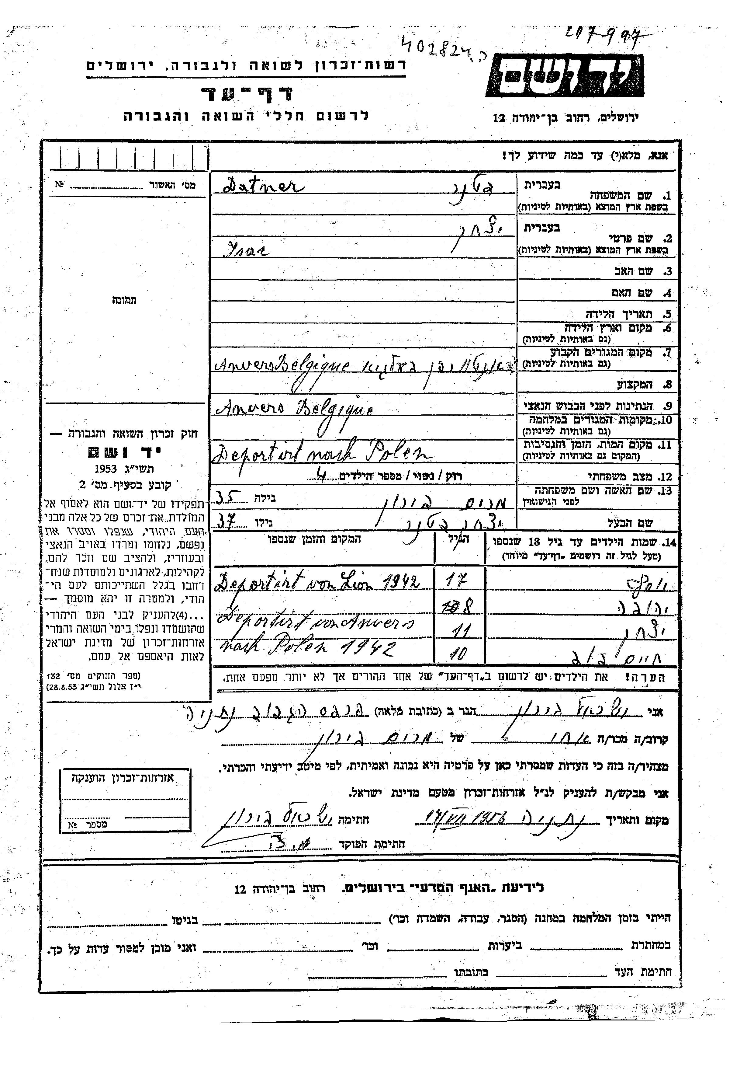 Ysak Datner. Er war mit Miriam, geb. Biron Verheiratet. Vor dem Zweiten Weltkrieg lebte er in Antwerpen, Belgien.