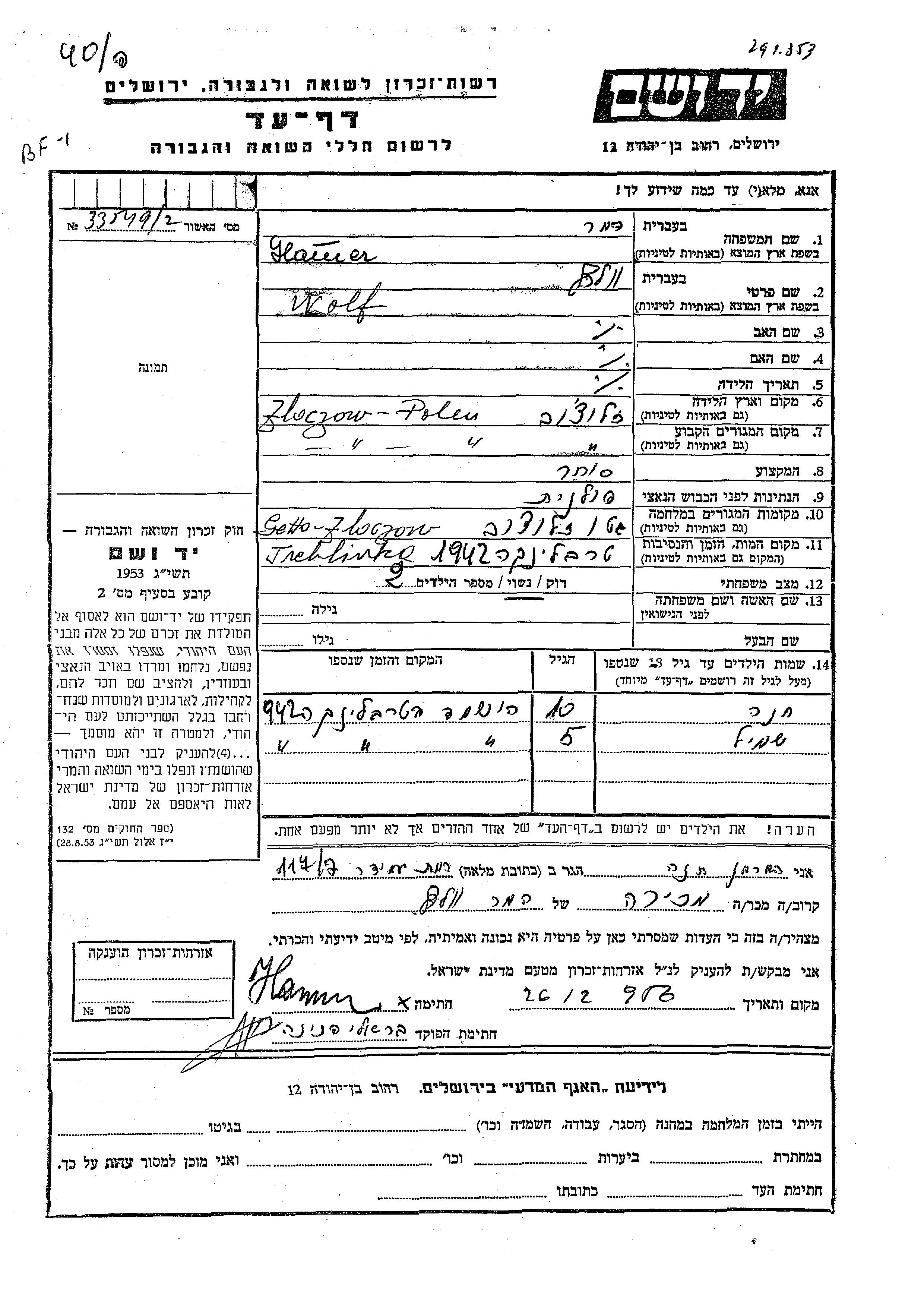 Wolf Hamer wurde in Zloczow, Polen geboren. Er war Kaufmann/-frau und Verheiratet. Vor dem Zweiten Weltkrieg lebte er in Zloczow, Polen. Während des Krieges war er in Zloczow, Polen.