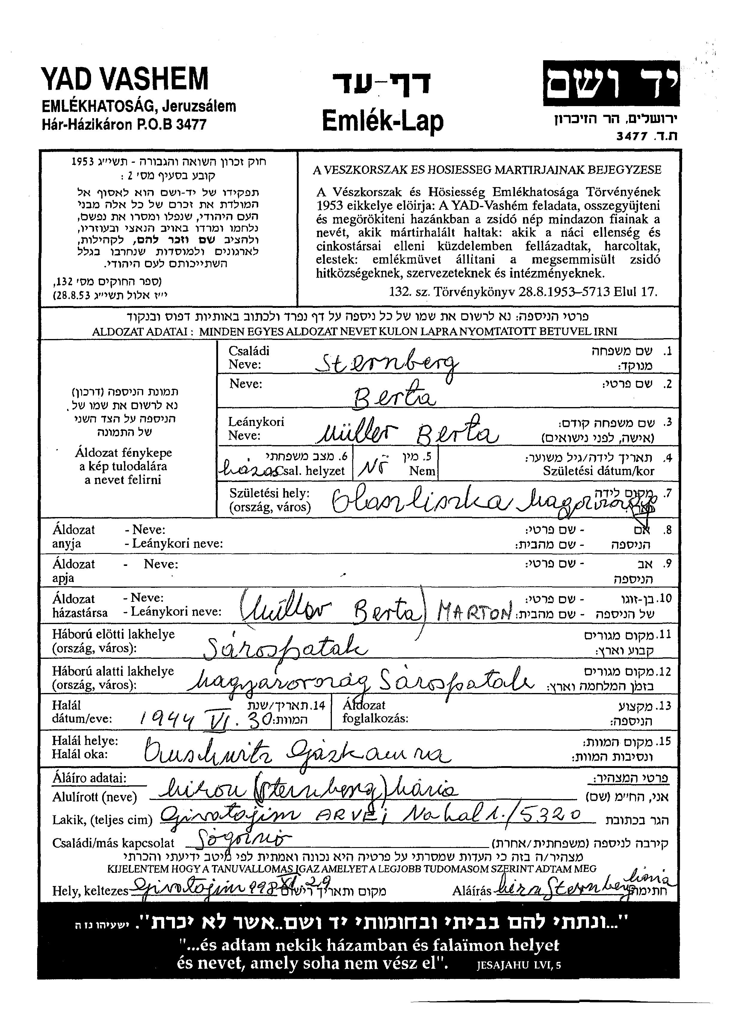 Berta Sternberg, geb. Muller wurde in Olaszliszka, Ungarn geboren. Sie war mit Marton Verheiratet. Während des Krieges war sie in Sarospatak, Ungarn.