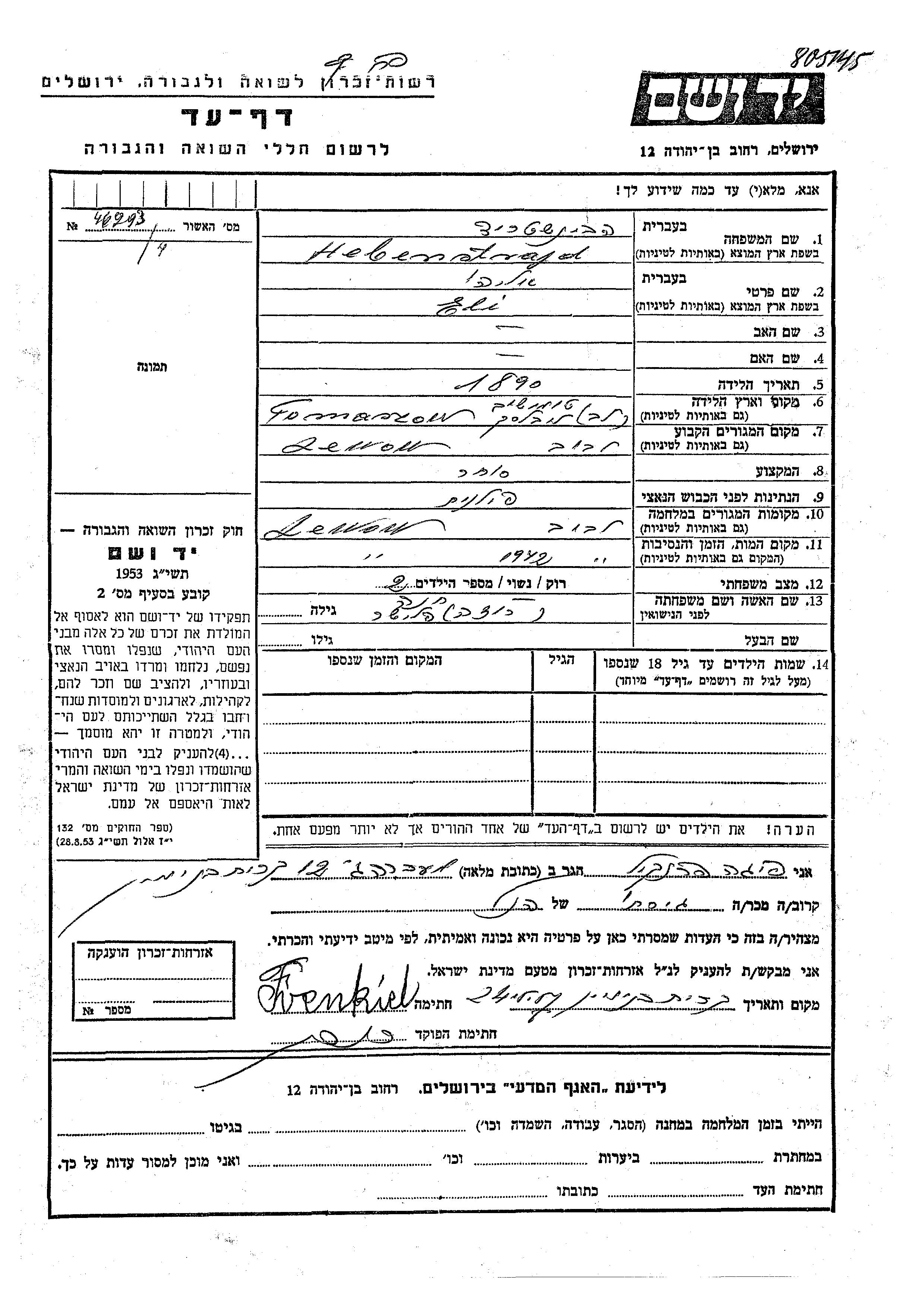 Eli wurde in der Schoah ermordet. Todesort: Lwow, Polen im Jahr 1942.